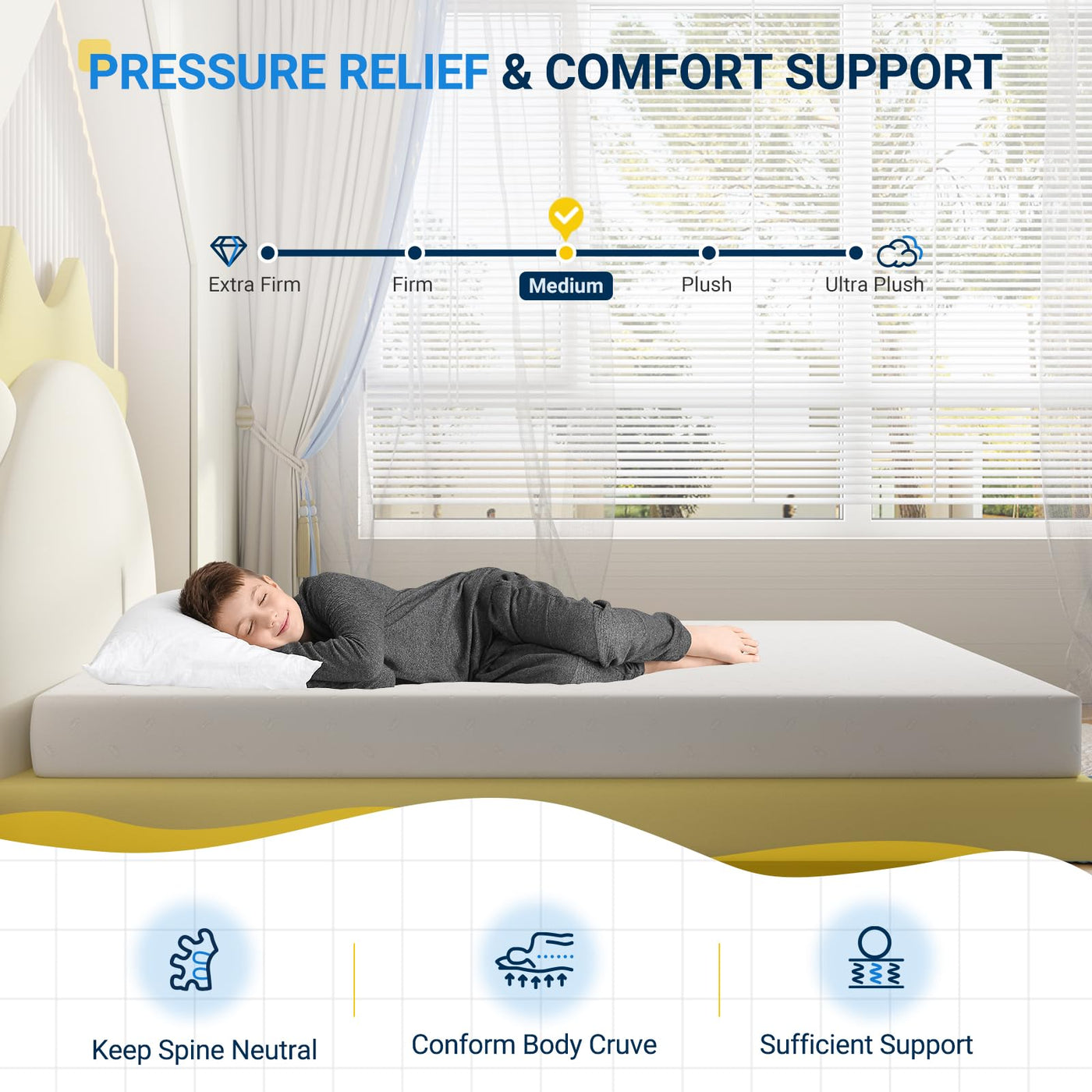 - Q: How does the 6-inch memory foam provide pressure relief? A: The mattress features a combination of 2 inches of gel memory foam and a 4-inch high-density foam base that contours to your body, providing effective pressure relief and support.