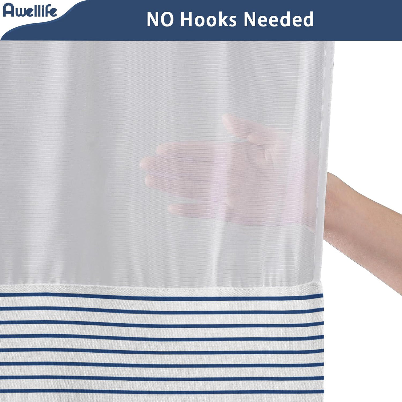 - Q: What are the dimensions of the Awellife No Hook Shower Curtain? A: The Awellife No Hook Shower Curtain measures 81 inches in length and 72 inches in width.