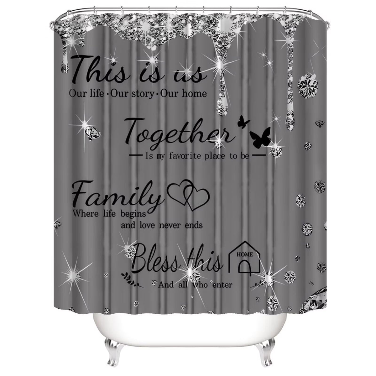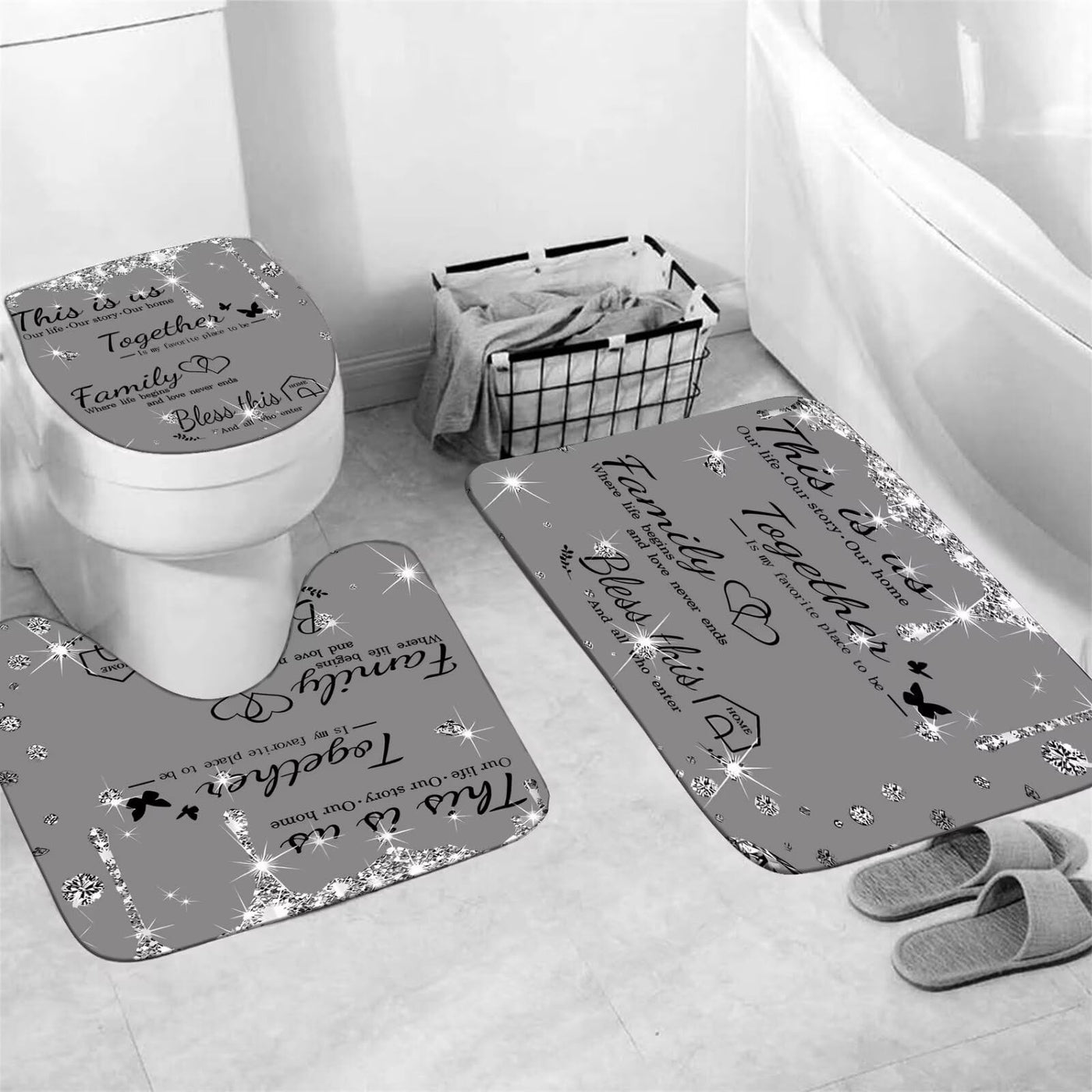Azhm Sparkling Diamond Letter Printed Shower Curtain Set For Bathroom 4 Pcs Family Bathroom Accessory Decor Sets With Shower Cur