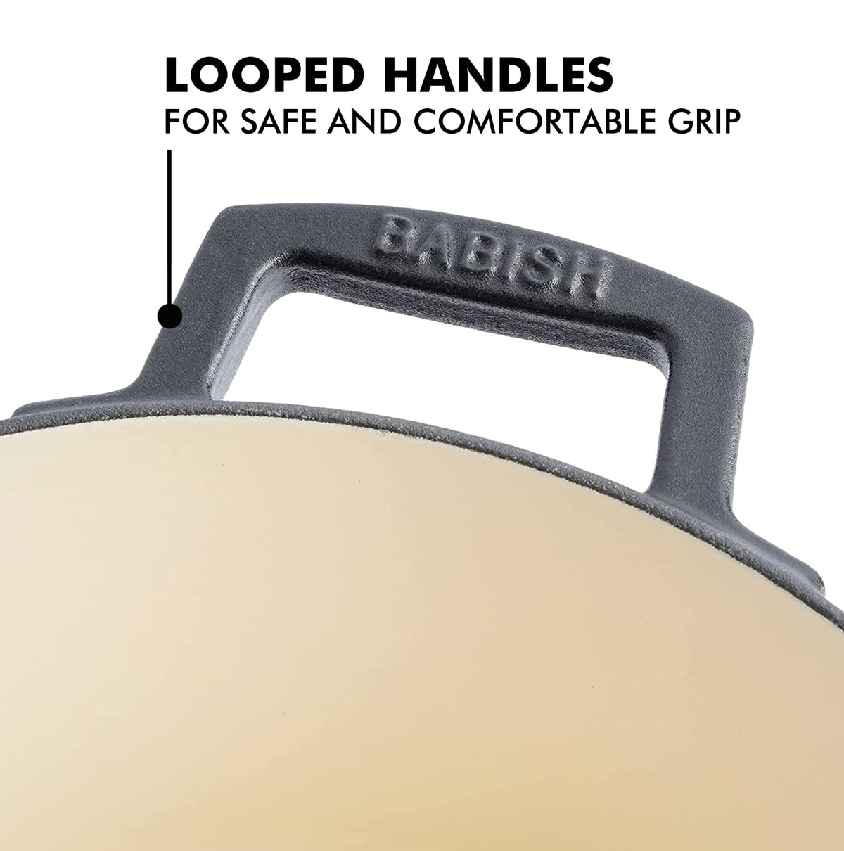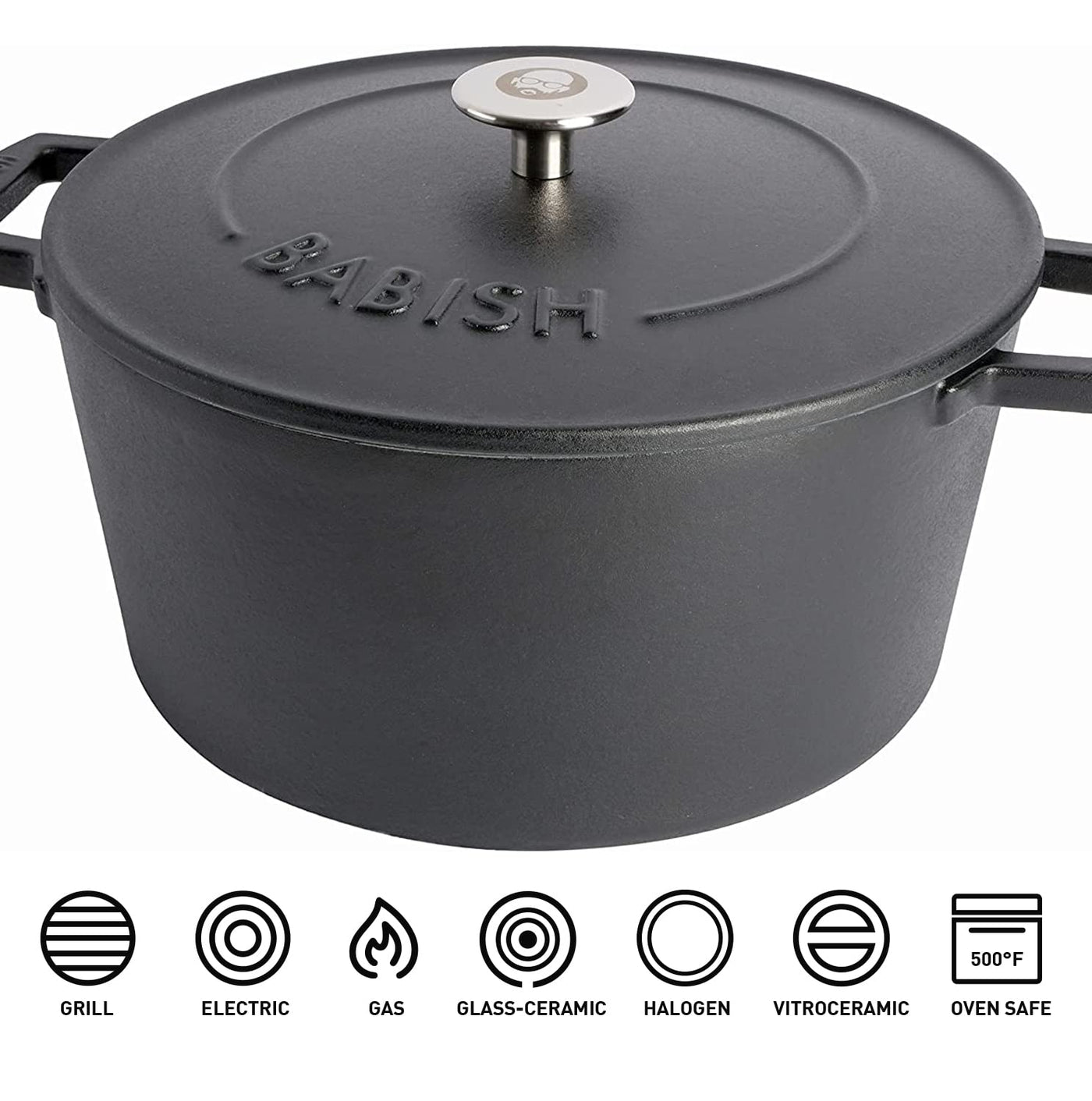 • Q: What is the capacity of the Babish Round Enamel Cast Iron Dutch Oven? A: The Babish Round Enamel Cast Iron Dutch Oven has a capacity of 6 quarts, making it suitable for preparing meals for families or gatherings.
