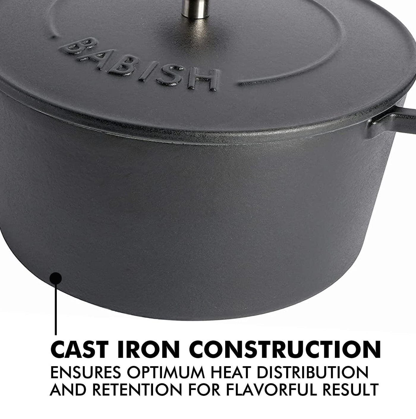 • Q: What is the material of the Babish Dutch oven? A: The Babish Round Enamel Cast Iron Dutch Oven is made from durable cast iron, providing excellent heat distribution and retention.