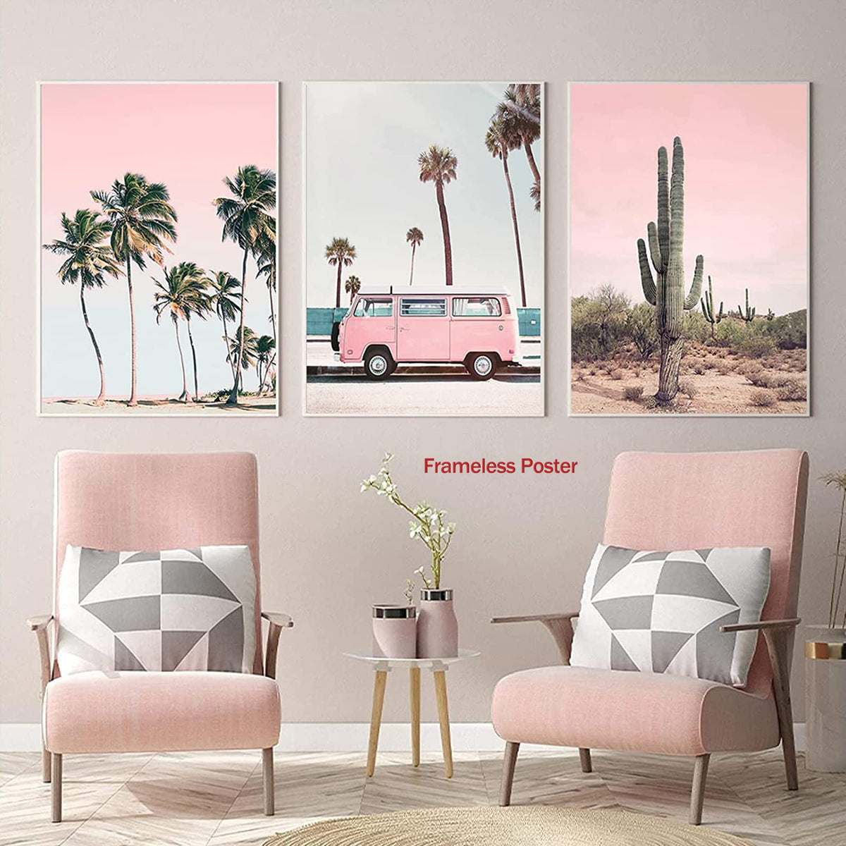 Backymrart Pink Landscape Art Car Wall Decor Beach Palm Tree Canvas Retro Poster And Sunset Scenery Bus Home 16X24Inx3 Frameless