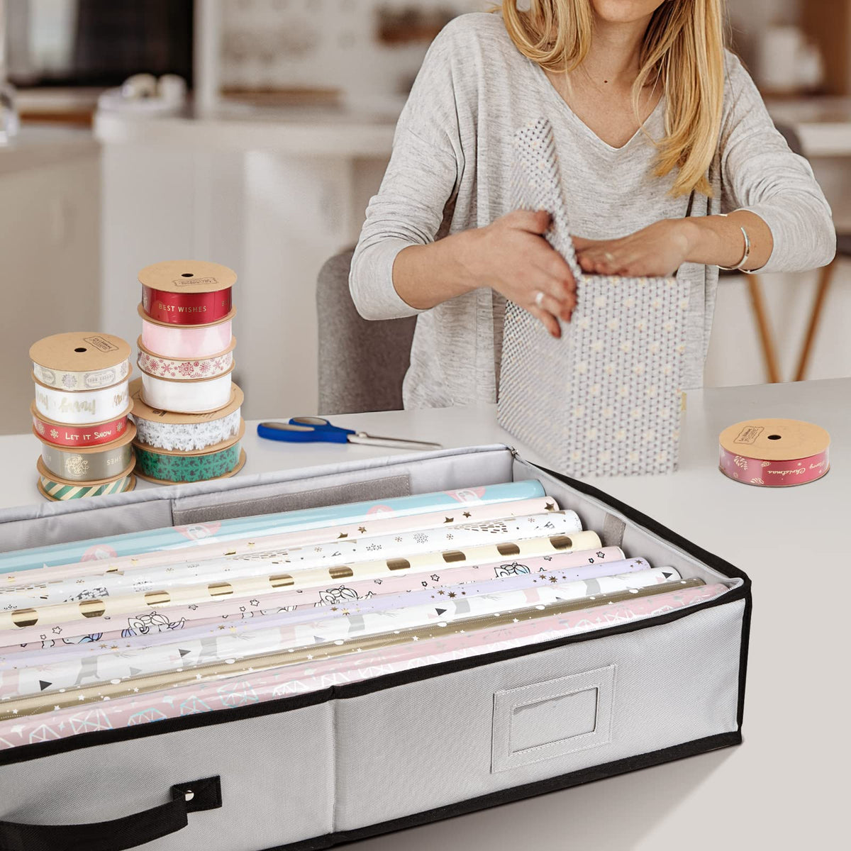 - Q: How many rolls of wrapping paper can this organizer hold? A: It can hold up to 18 rolls of 2.5” thick wrapping paper or up to 24 rolls of 1.5” thick paper, depending on the thickness of the rolls.