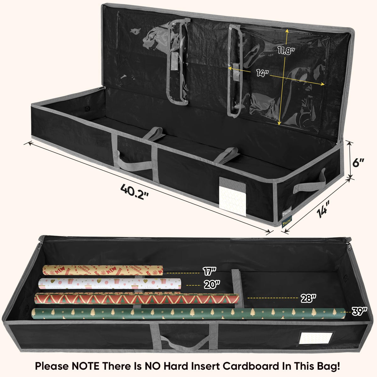 - Q: How should I care for the wrapping paper storage bag? A: To maintain the bag, wipe it clean with a damp cloth as needed. Avoid exposing it to sharp objects that may cause tears.