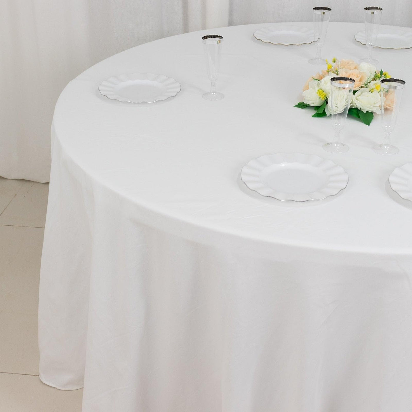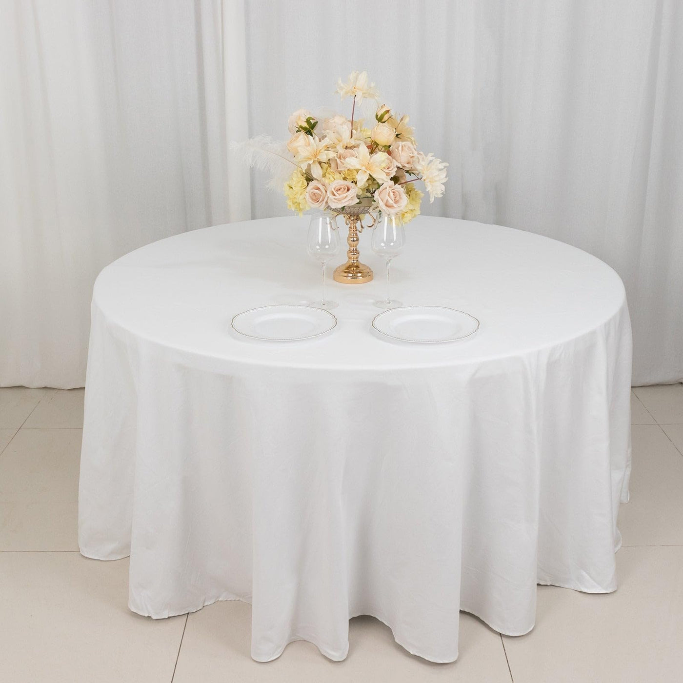 - Q: Will this tablecloth fit standard round tables? A: Yes, the 120-inch diameter tablecloth is designed to fit standard round tables nicely.