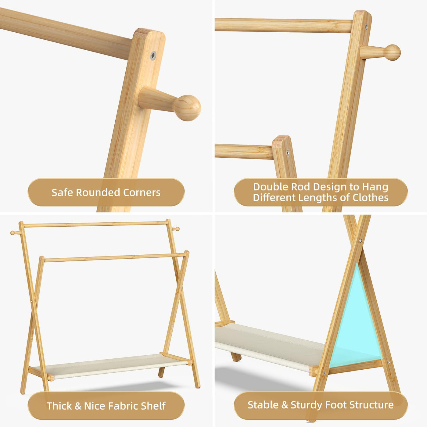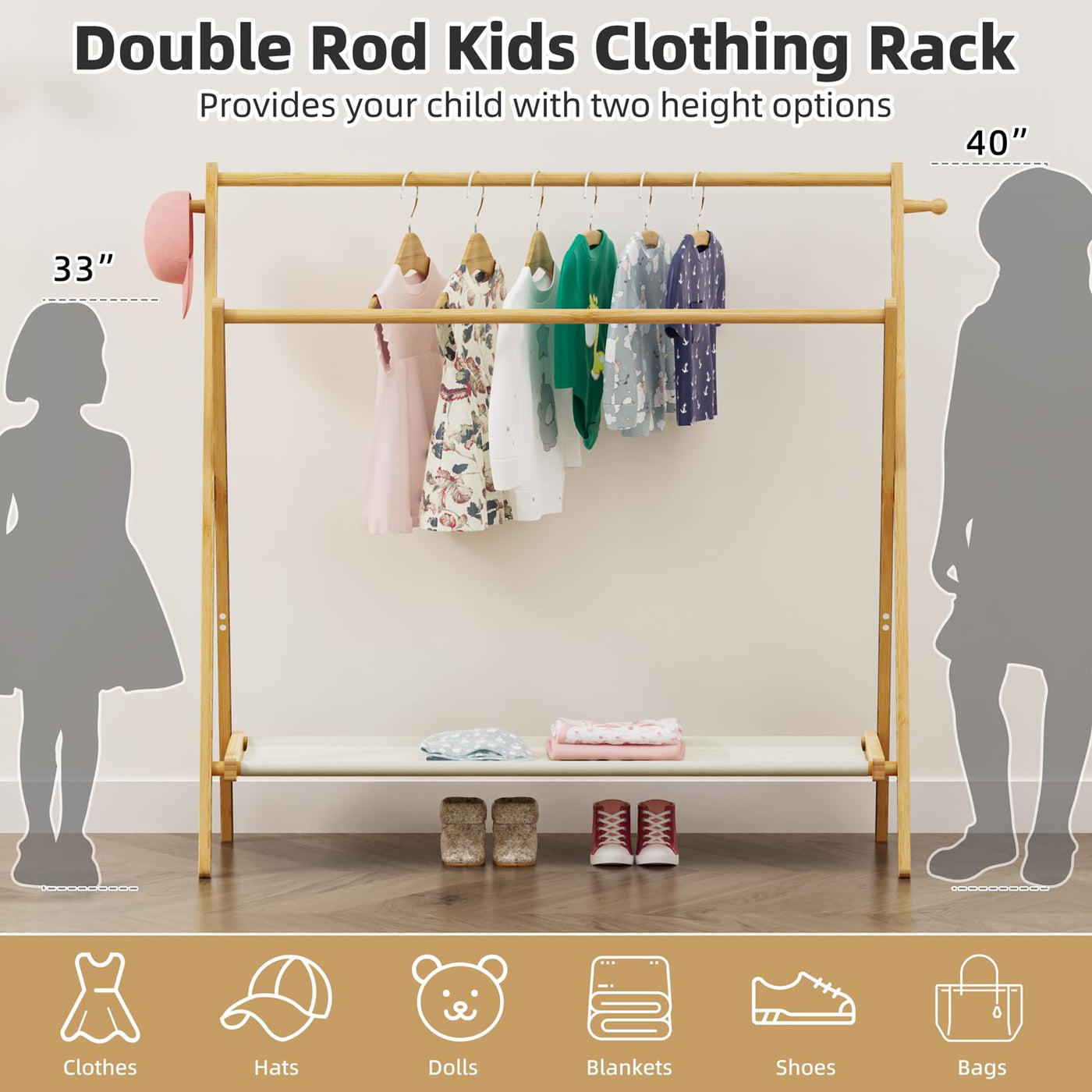 Bamboohomie Kids Clothing Rack, Kids Dress Up Rack With Storage Shelf & Double Rods, Foldable Kids Dress Up Clothes Rack For Tod