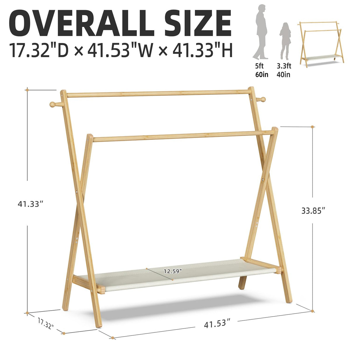 - Q: What is the size of the BAMBOOHOMIE Kids Clothing Rack? A: The BAMBOOHOMIE Kids Clothing Rack measures 41.5 inches in length, 17.3 inches in width, and 41.3 inches in height.