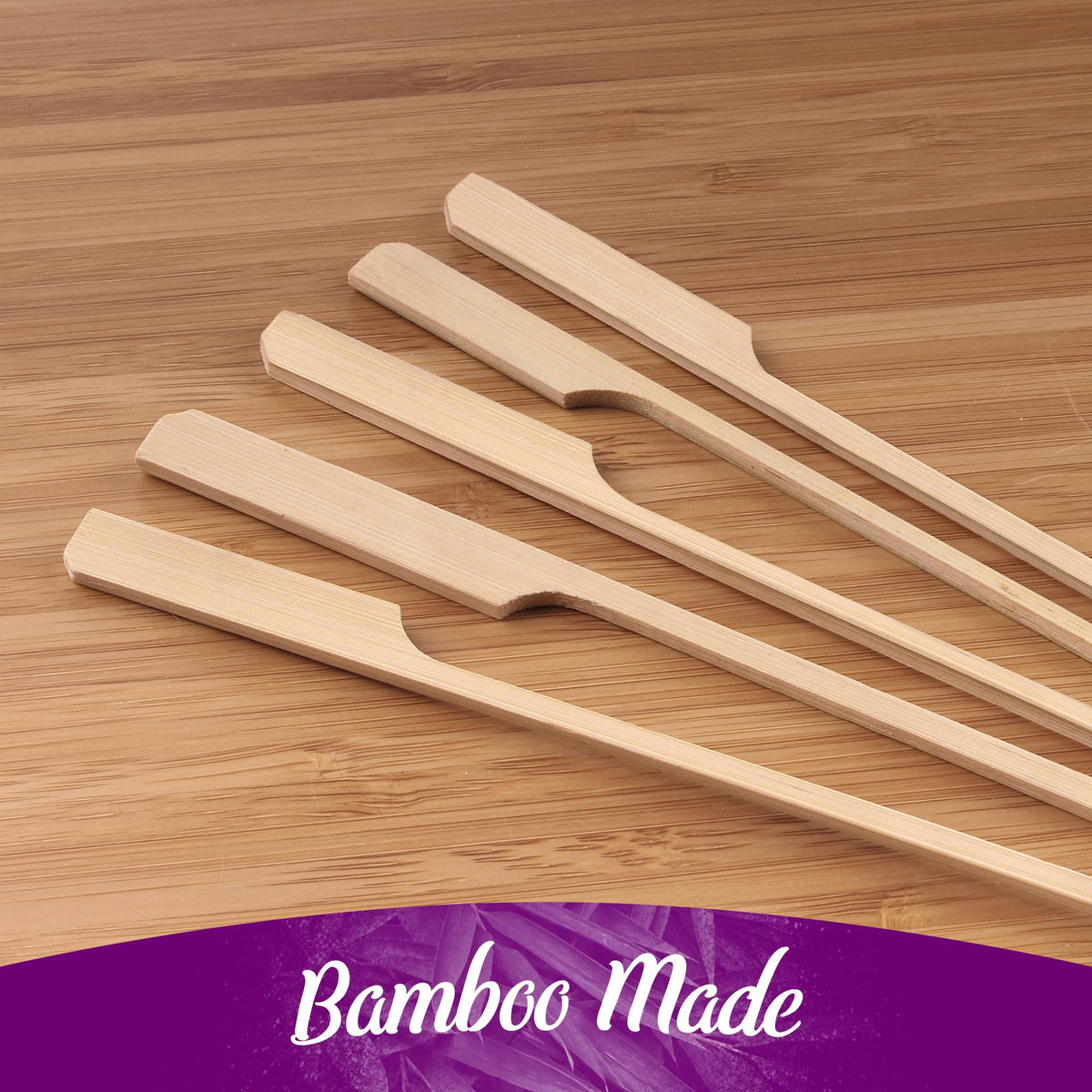- Q: What are the dimensions of the BambooMN Bamboo Paddle Pick Skewers? A: The BambooMN Bamboo Paddle Pick Skewers are approximately 10.6 inches in length.