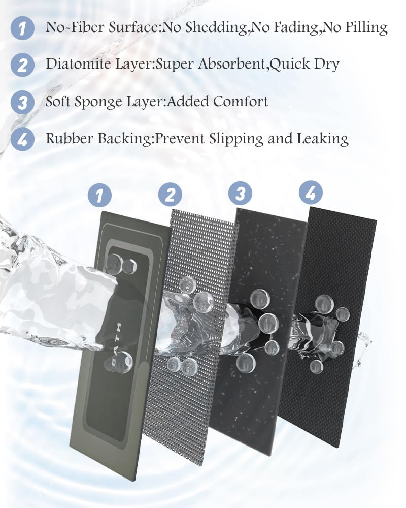• Q: Does the mat dry quickly after use? A: Yes, the bath mat features numerous tiny pores that promote quick water evaporation, allowing it to dry rapidly.