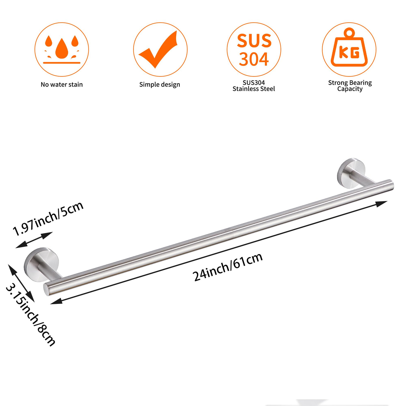 - Q: How long is the Bath Towel Bar? A: The Bath Towel Bar measures 24 inches in length, providing ample space for hanging towels.