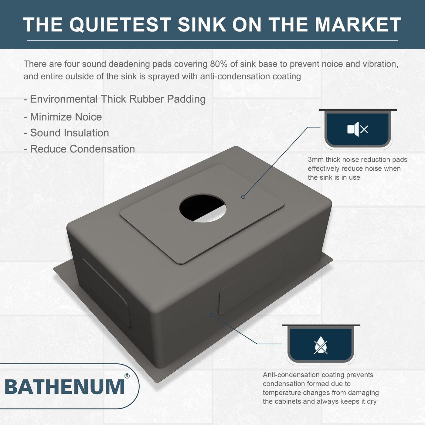 - Q: How does the noise reduction feature work? A: The Bathenum sink is equipped with sound-deadening rubber pads on the underside and three sides, which help to minimize noise and vibration during use.