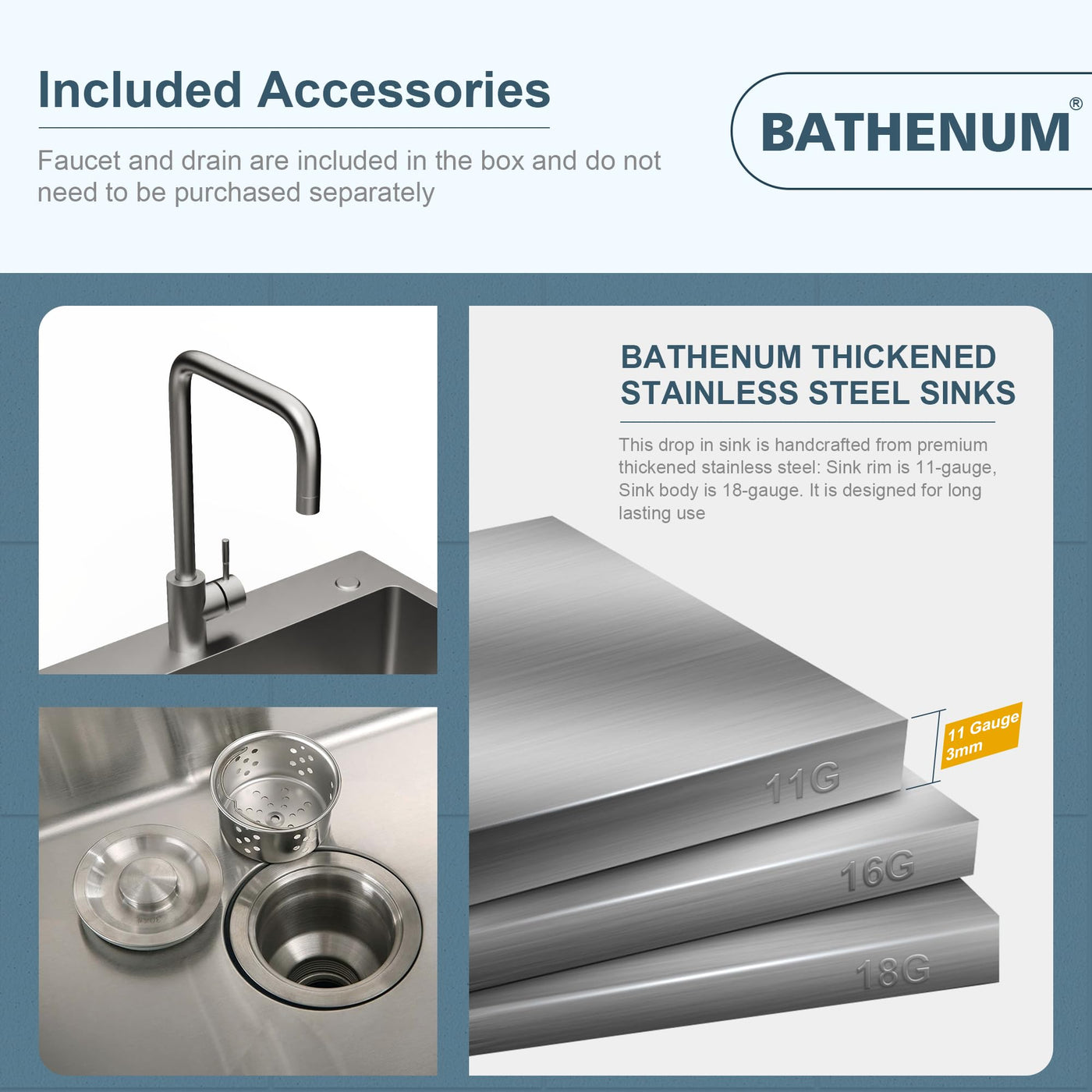- Q: Does the sink come with a faucet and drain kit? A: Yes, the Bathenum kitchen sink includes one stainless steel sink, one faucet, and one drain kit.