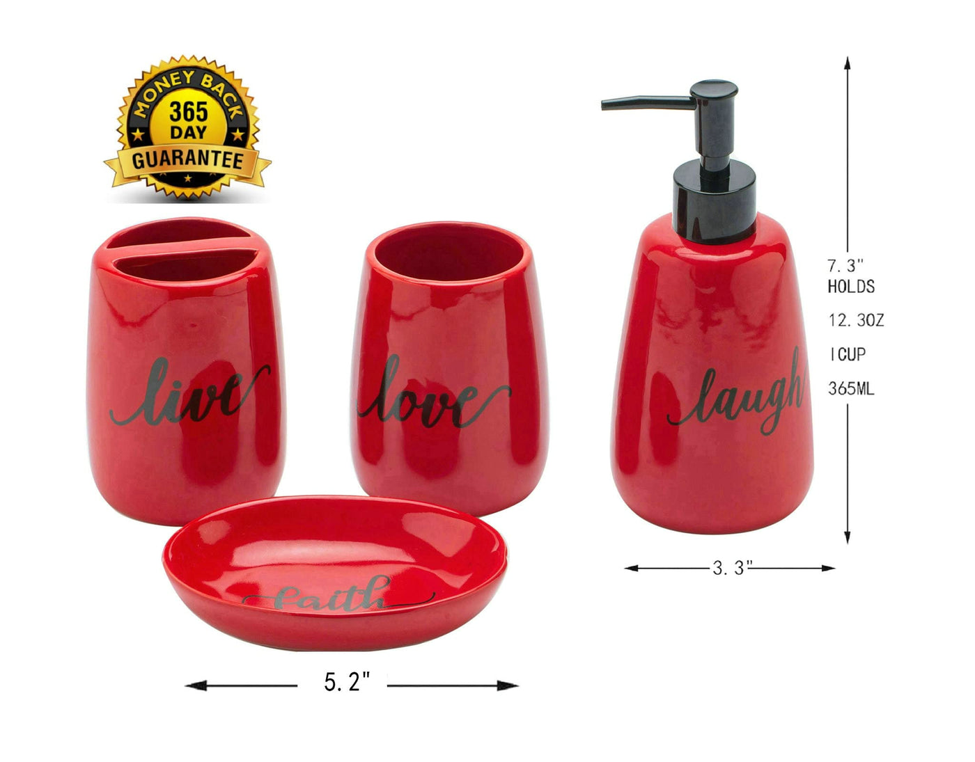 • Q: What is included in the Bathroom accessory set? A: The Bathroom accessory set includes a liquid soap/lotion dispenser, a toothbrush holder, a tumbler cup, and a soap dish, all made from red ceramic.