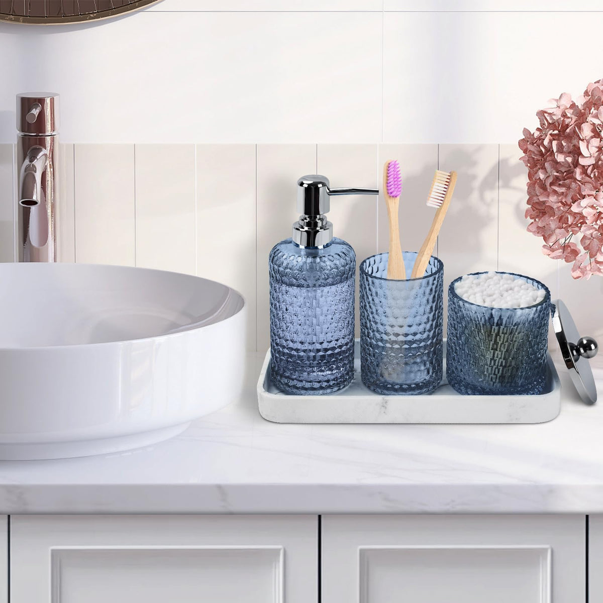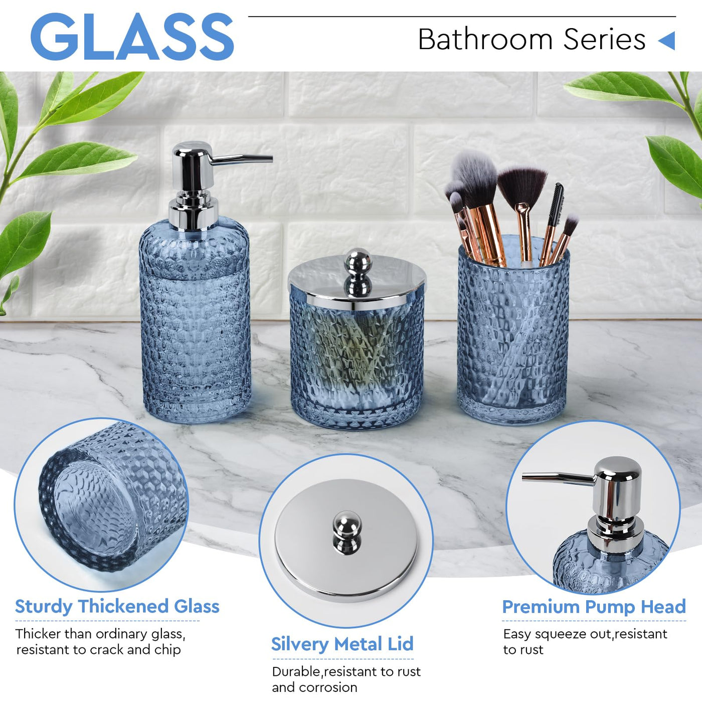 Bathroom Accessories Set,4 Pcs Blue Glass Bathroom Accessories Sets-Lotion Soap Dispenser,Toothbrush Holder,Qtip Holder Dispense