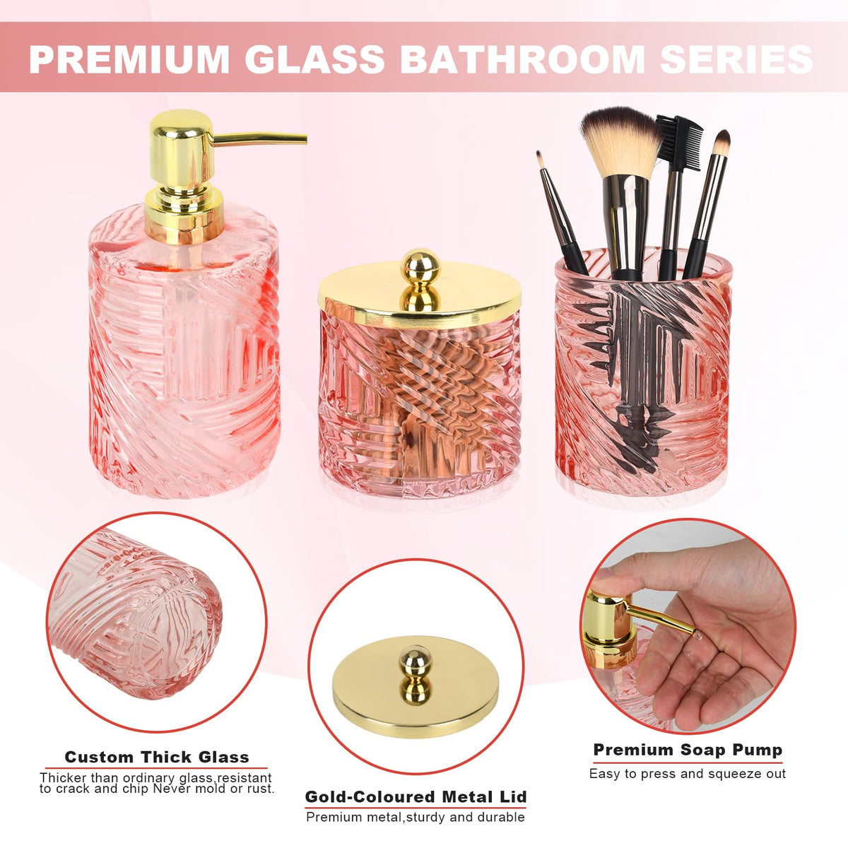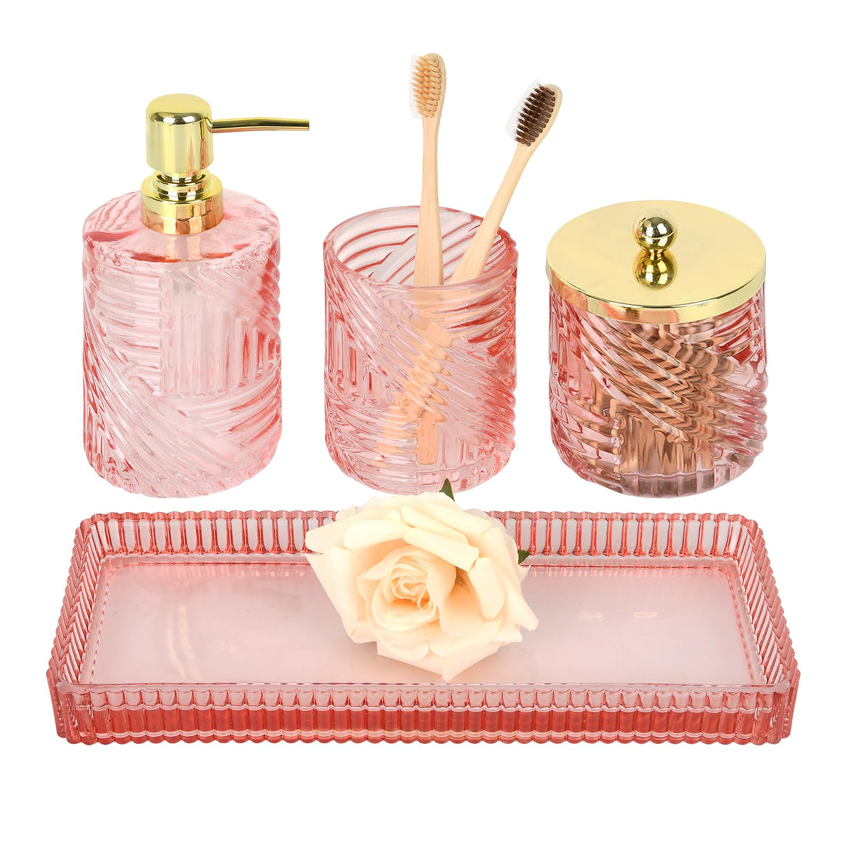 Bathroom Accessories Set,4 Pcs Pink Glass Bathroom Accessories Sets Complete With Lotion Soap Dispenser,Toothbrush Holder,Qtip H