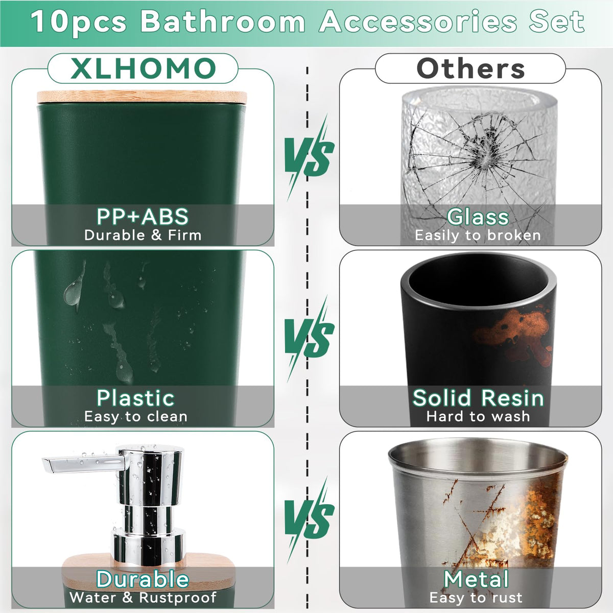 • Q: What color options are available for this bathroom set? A: This bathroom accessory set is available in a stylish Hunter Green color, which can complement various bathroom decors.