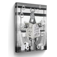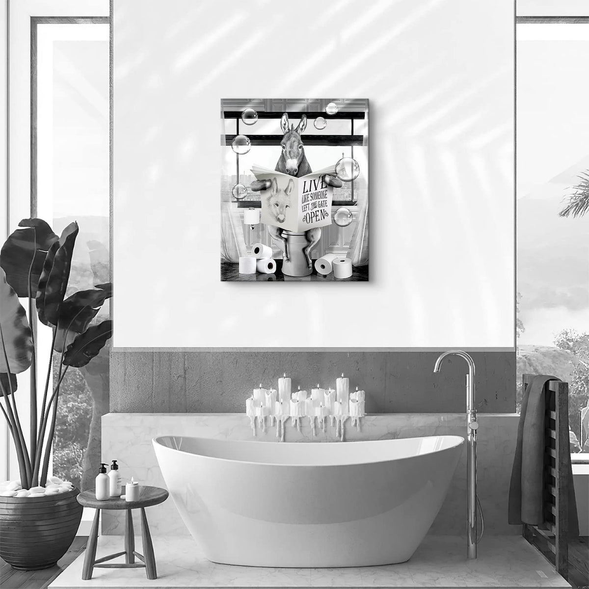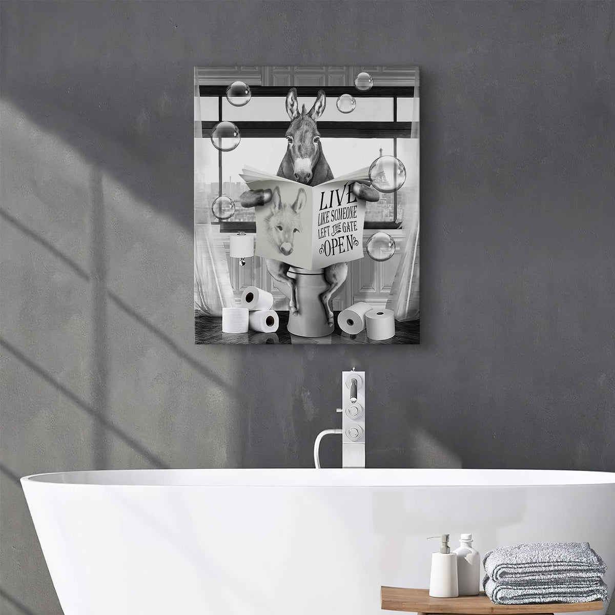 - Q: What themes does this artwork feature? A: The artwork features a humorous design of a donkey sitting on a toilet reading a newspaper, fitting for a farmhouse bathroom decor.