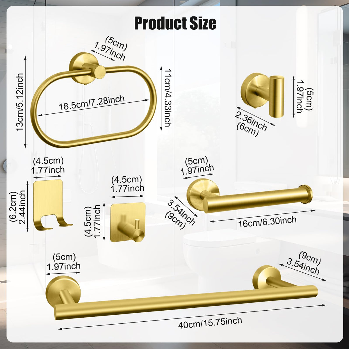 • Q: What is included in the Bathroom Hardware Set? A: The Bathroom Hardware Set includes 7 pieces: a 16" hand towel bar, a toilet paper holder, towel rings, and 4 robe hooks, along with screws and installation instructions.