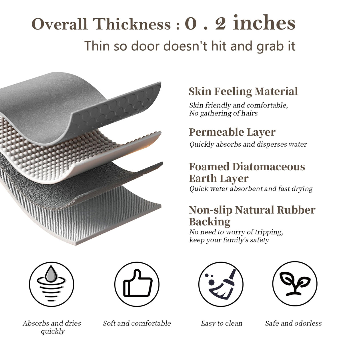 • Q: What materials are used in the Bathroom Runner Mat? A: The Bathroom Runner Mat is crafted from high-quality faux suede and features a diatomaceous earth core for super absorbency.