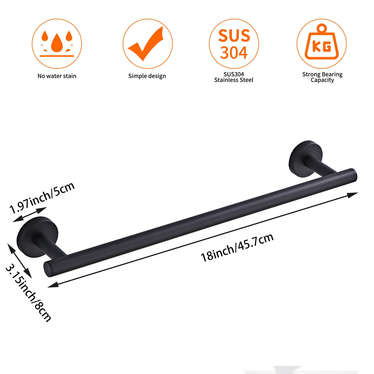 - Q: What is the length of the towel bar? A: The towel bar measures 18 inches in length, making it suitable for most bathroom spaces.