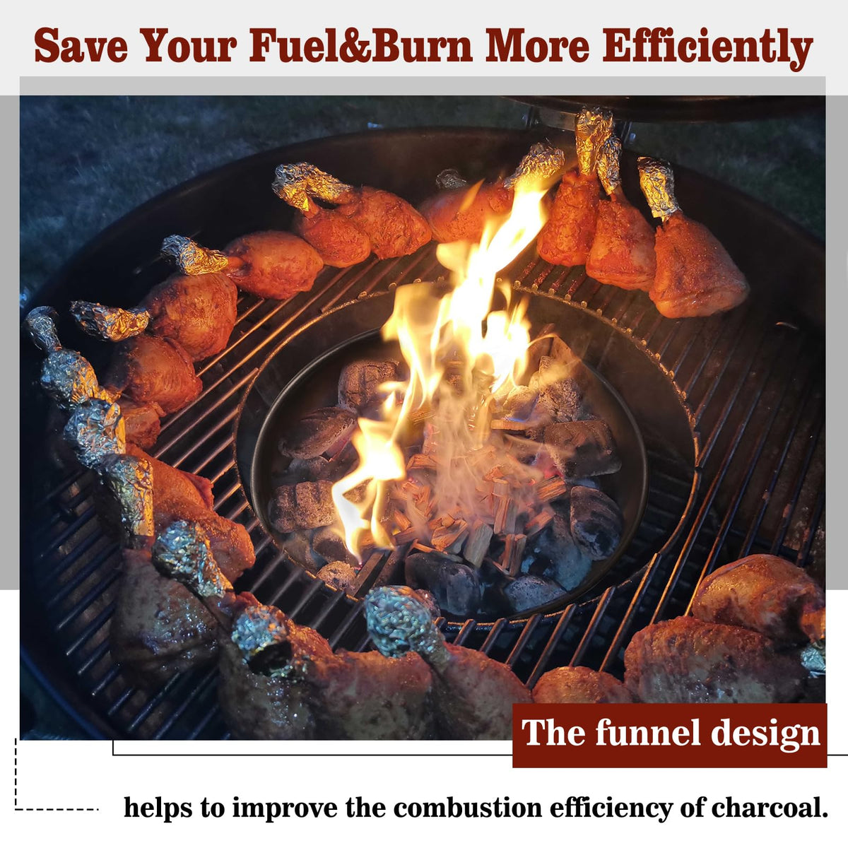 - Q: How does the BBQ Whirlpool improve cooking efficiency? A: The funnel design of the BBQ Whirlpool allows for improved combustion efficiency, extending charcoal burn time and reducing fuel consumption while achieving high heat for searing.