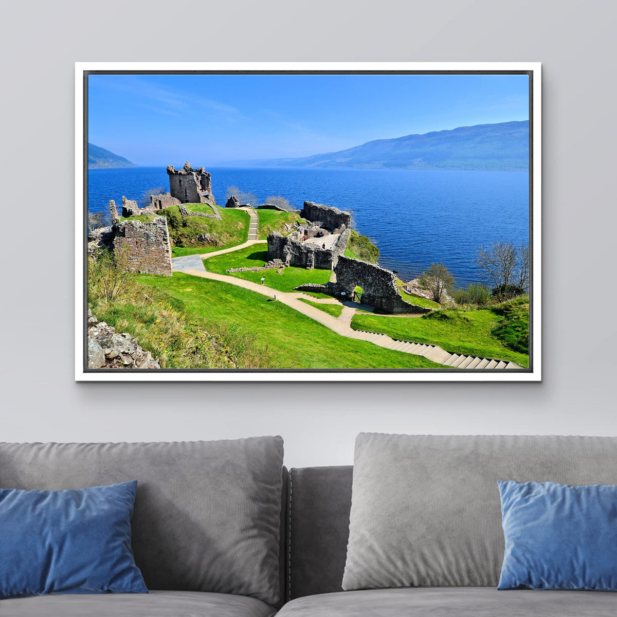 Beautiful Scenery Landscape of Ruins of Urquhart Castle Along Loch Ness Scotland - Framed Canvas Art Wall Art - 24''x36'' White