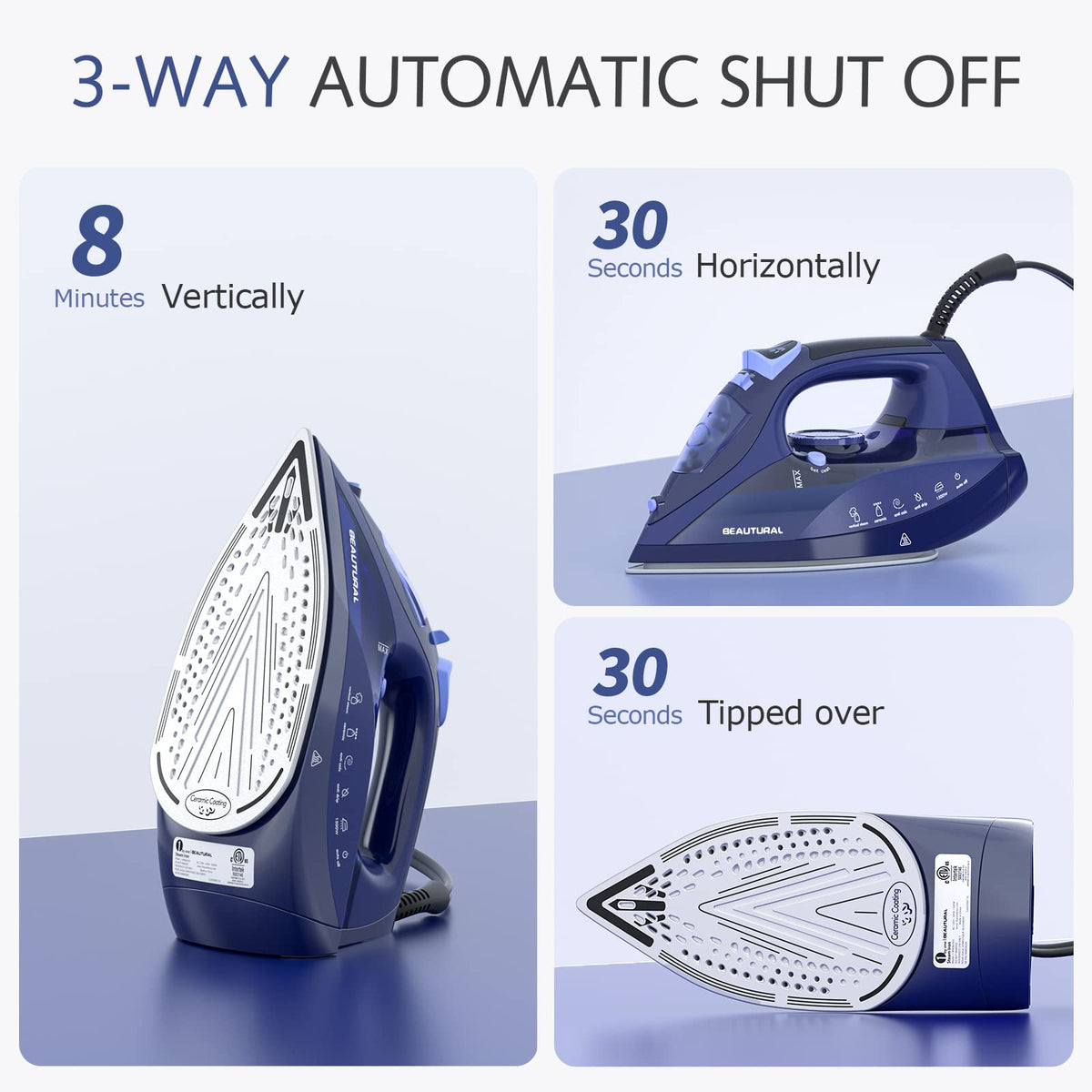 - Q: What safety features does this steam iron have? A: The iron includes a 3-way automatic shut-off system that turns off the device after 8 minutes if left vertical and after 30 seconds if left horizontal or tipped over.