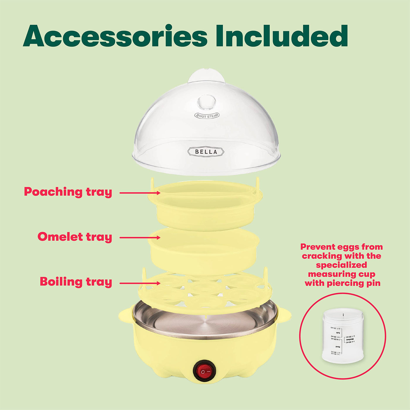 - Q: Is the BELLA Egg Cooker easy to clean? A: Yes, the lid, trays, and measuring cup are dishwasher safe, making cleanup easy and mess-free.