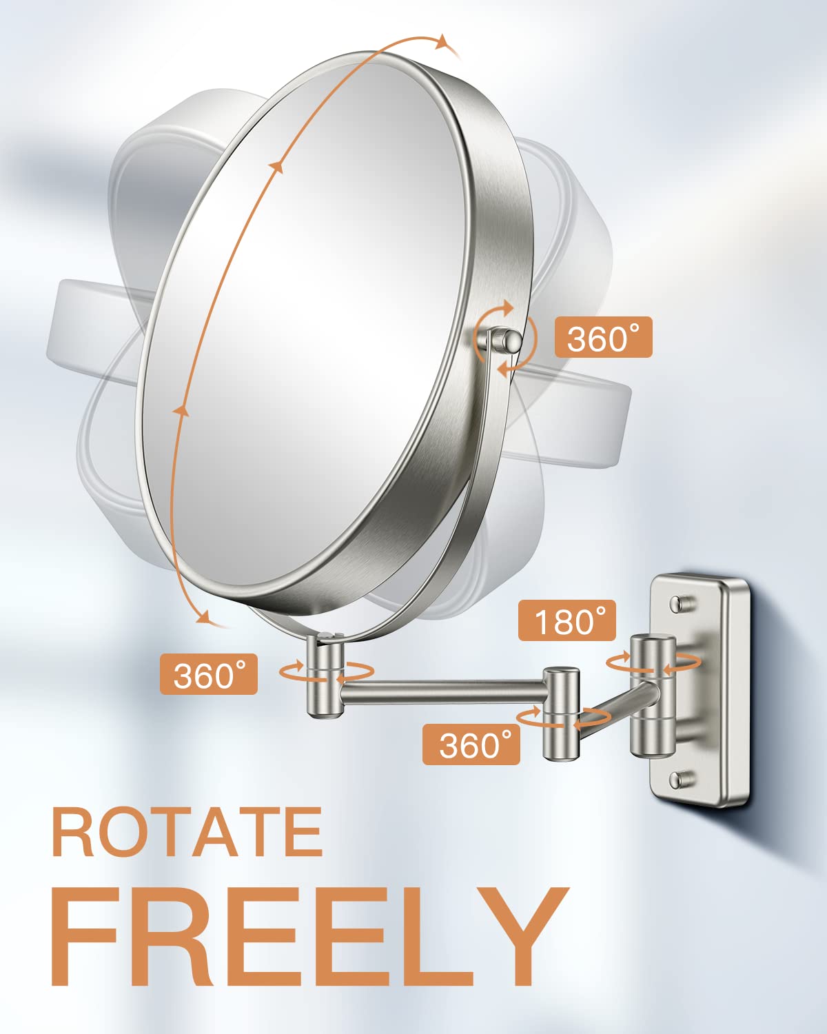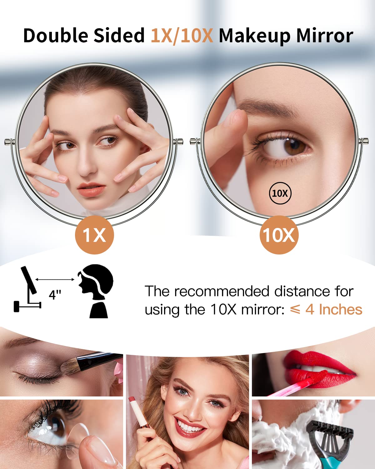 Benbilry 9'' Large Size Wall Mounted Makeup Mirror With 10X Magnification, Extendable Double Sided Vanity Mirror, 360