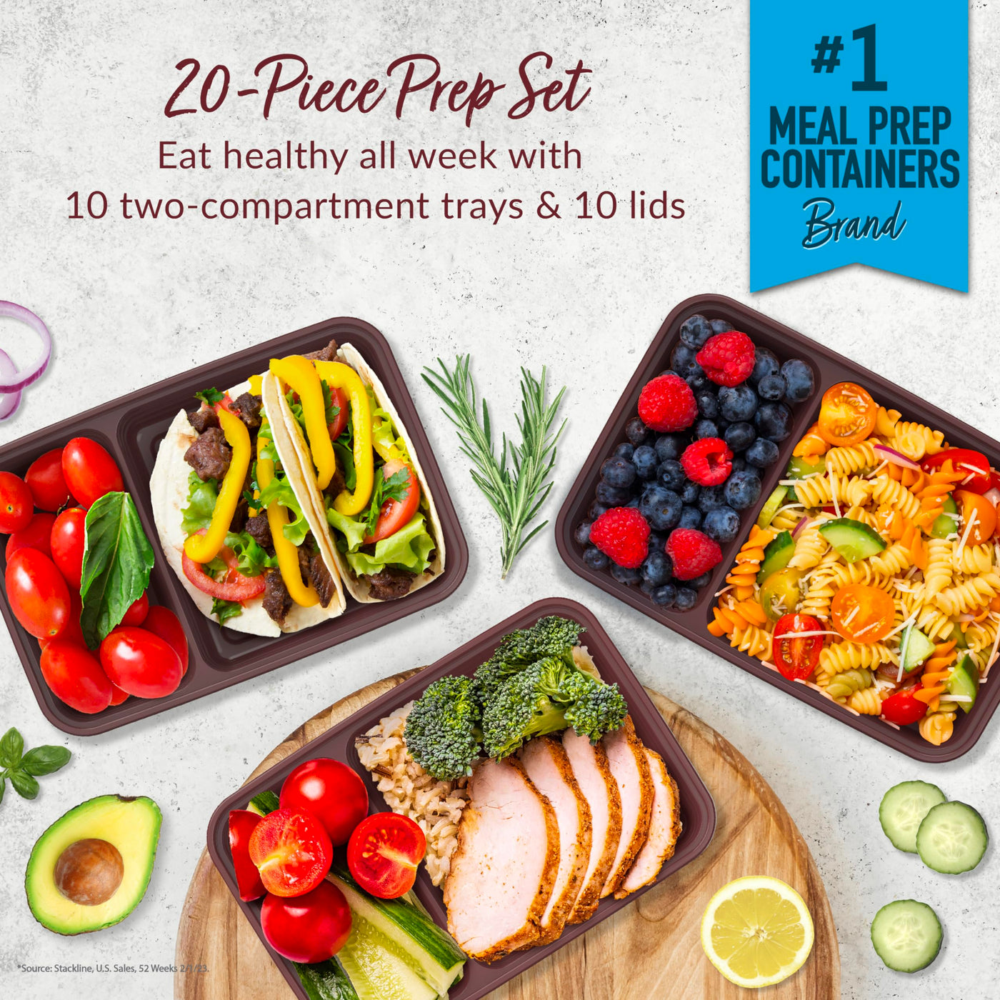 - Q: How many containers and lids come in the Bentgo Prep set? A: The Bentgo Prep set includes 10 two-compartment trays and 10 custom-fit lids.