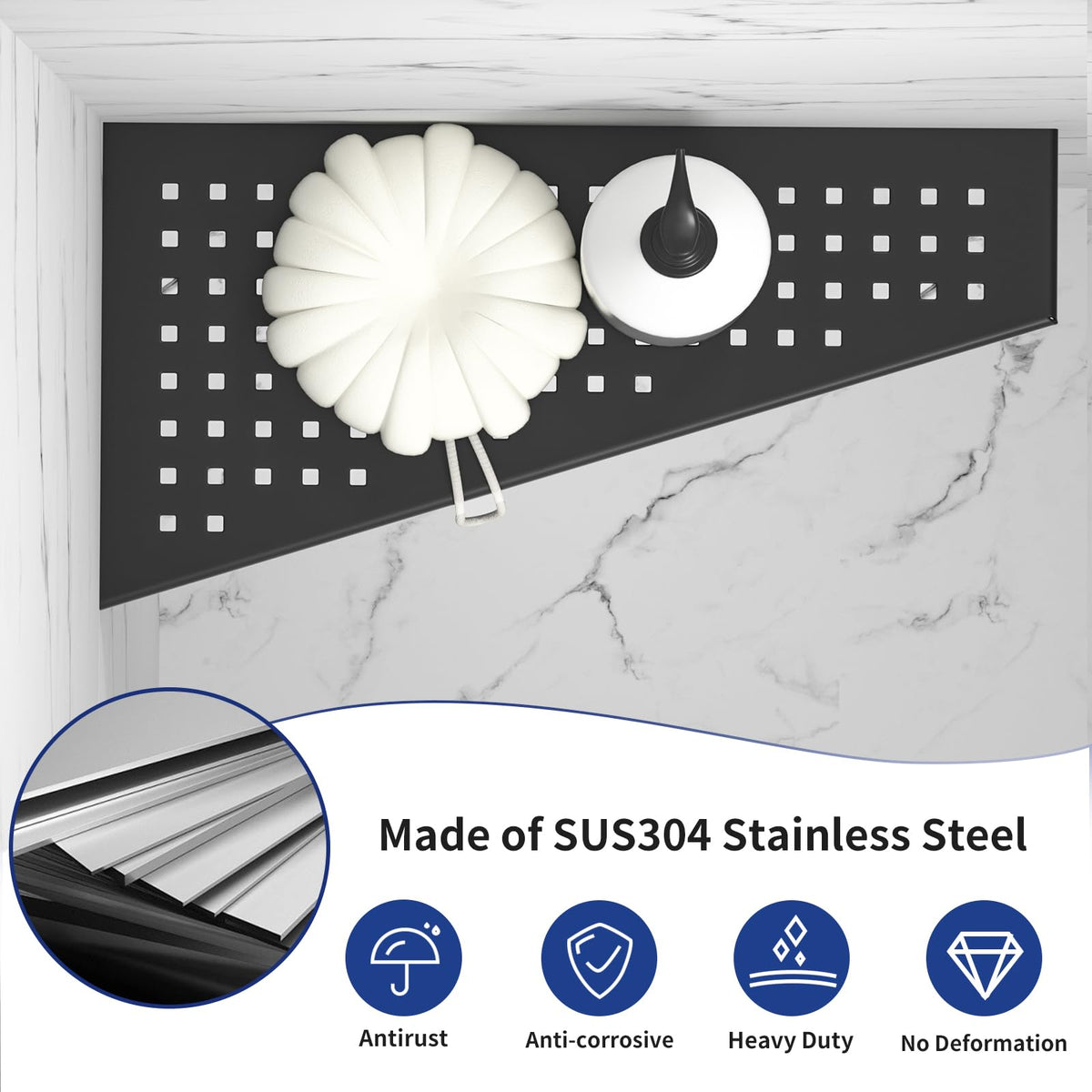 Bernkot Corner Shower Shelf, Matte Black 12'' Trapezoid Floating Shampoo Shelf, 304 Stainless Steel Grid Design Recessed Bathroo