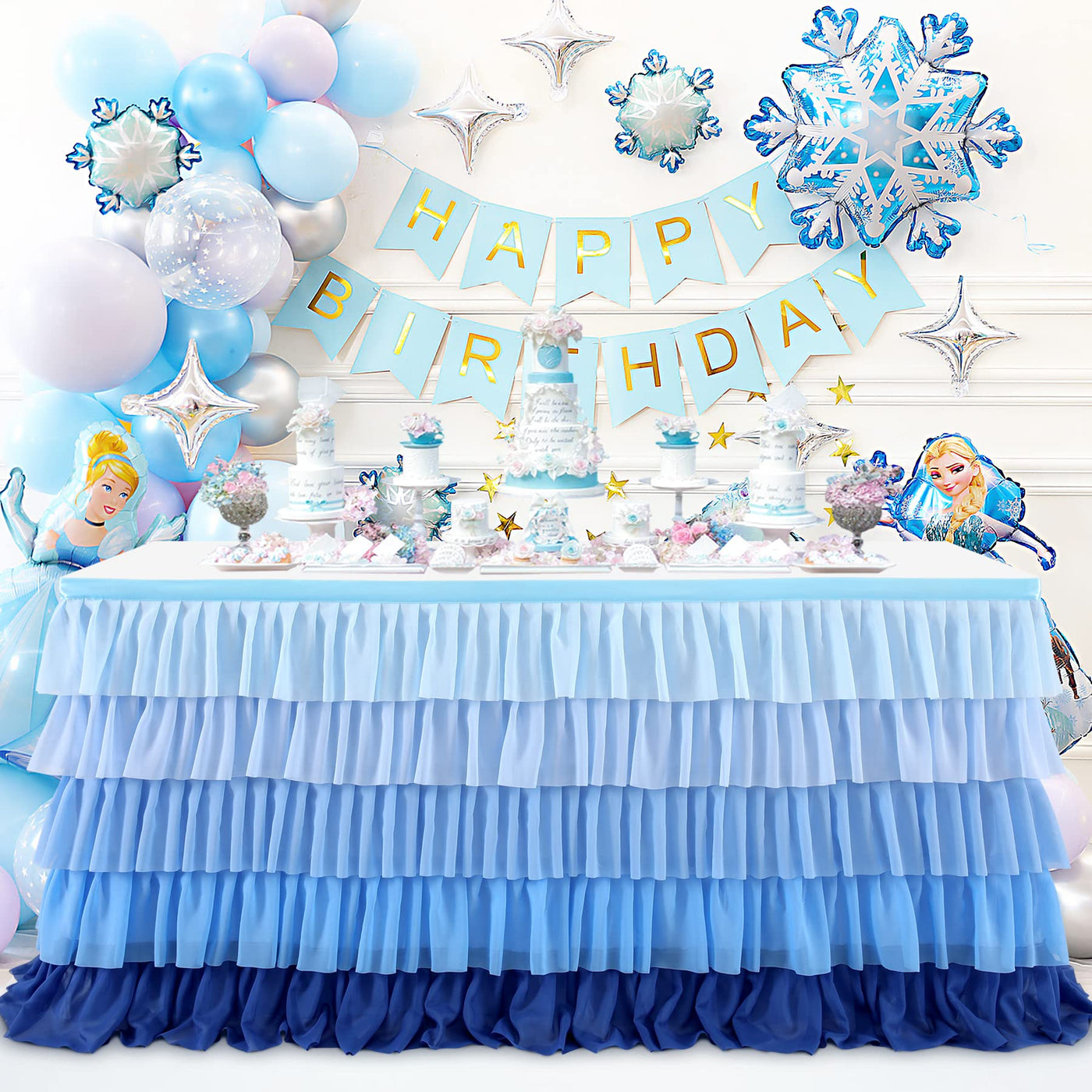 - Q: What themes is this table skirt suitable for? A: This table skirt is perfect for ocean-themed parties, Frozen birthday parties, baby showers, gender reveal parties, and mermaid-themed celebrations.