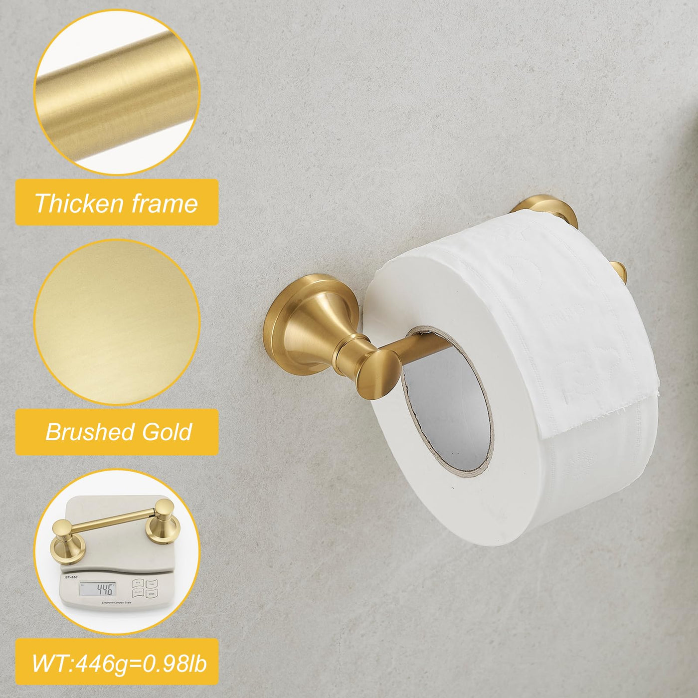 - Q: Is this toilet paper holder suitable for all bathroom styles? A: The brushed gold finish and modern design make it suitable for a variety of bathroom styles, from contemporary to traditional.