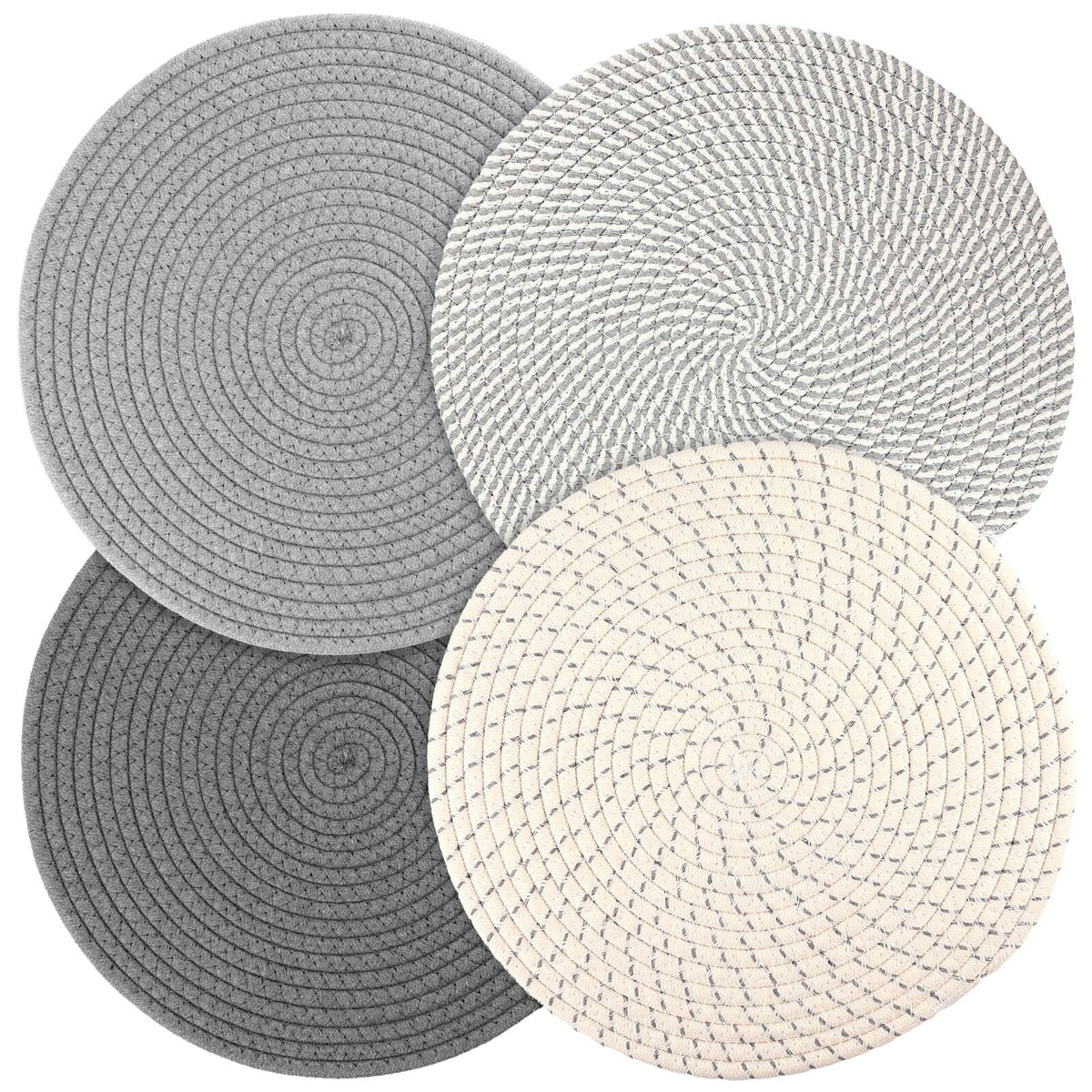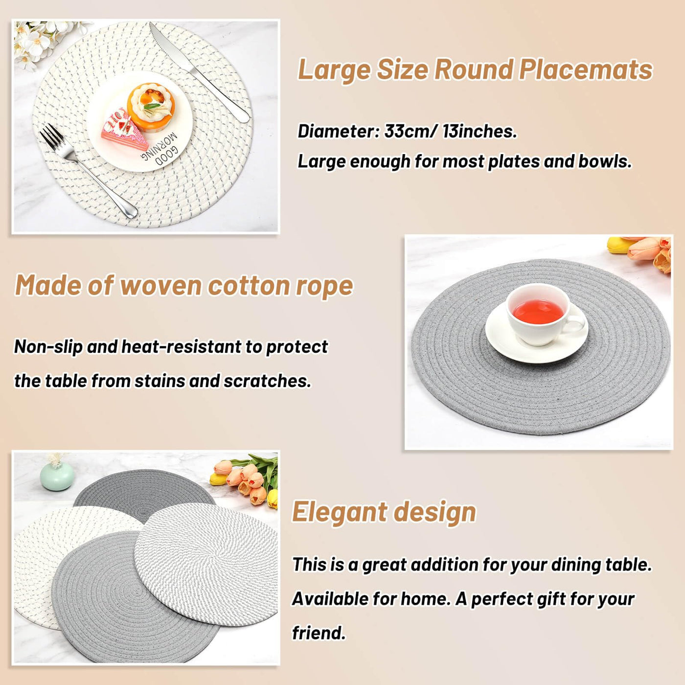 • Q: What material are these placemats made of? A: These placemats are woven from natural cotton rope, which is durable, stain resistant, and heat-resistant.