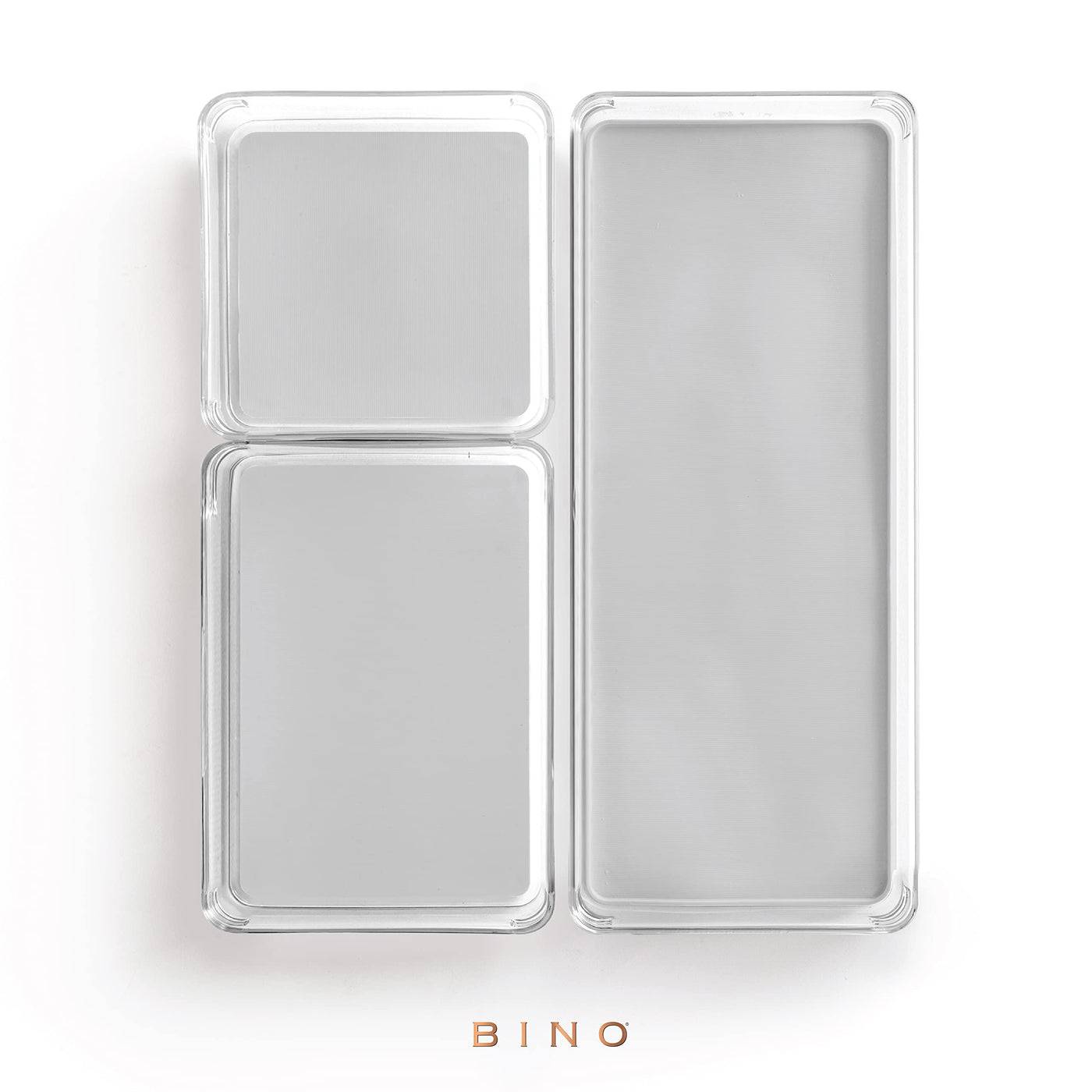 - Q: What colors are available for the BINO bins? A: The BINO 3-Piece Drawer Organizer Bin Set is available in Grey.