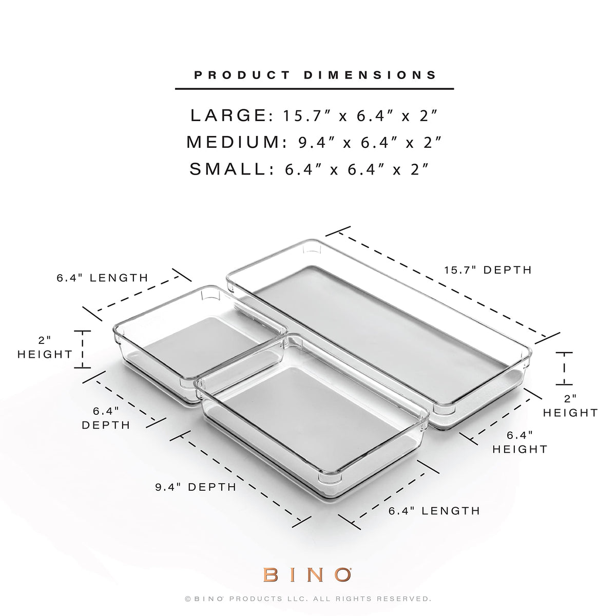 - Q: What are the dimensions of the BINO 3-Piece Drawer Organizer Bin Set? A: The set includes three bins with the following dimensions: Large - 15.7 inches long, 6.4 inches wide, and 2 inches high; Medium - 9.4 inches long, 6.4 inches wide, and 2 inches high; Small - 6.4 inches long, 6 inches wide, and 2 inches high.