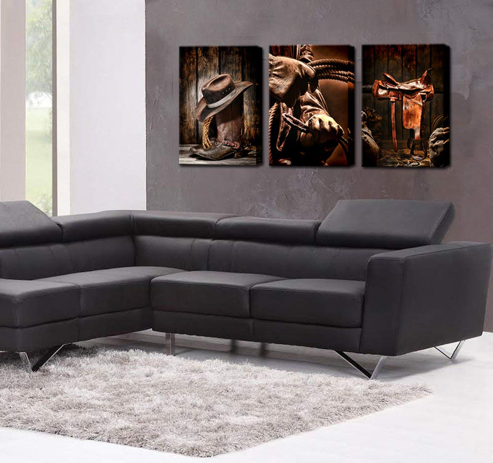 Biuteawal - 3 Pieces Canvas Prints American West Rodeo Cowboy Wall Art Painting Brown Straw Hat On Leather Rancher Roper Boots P