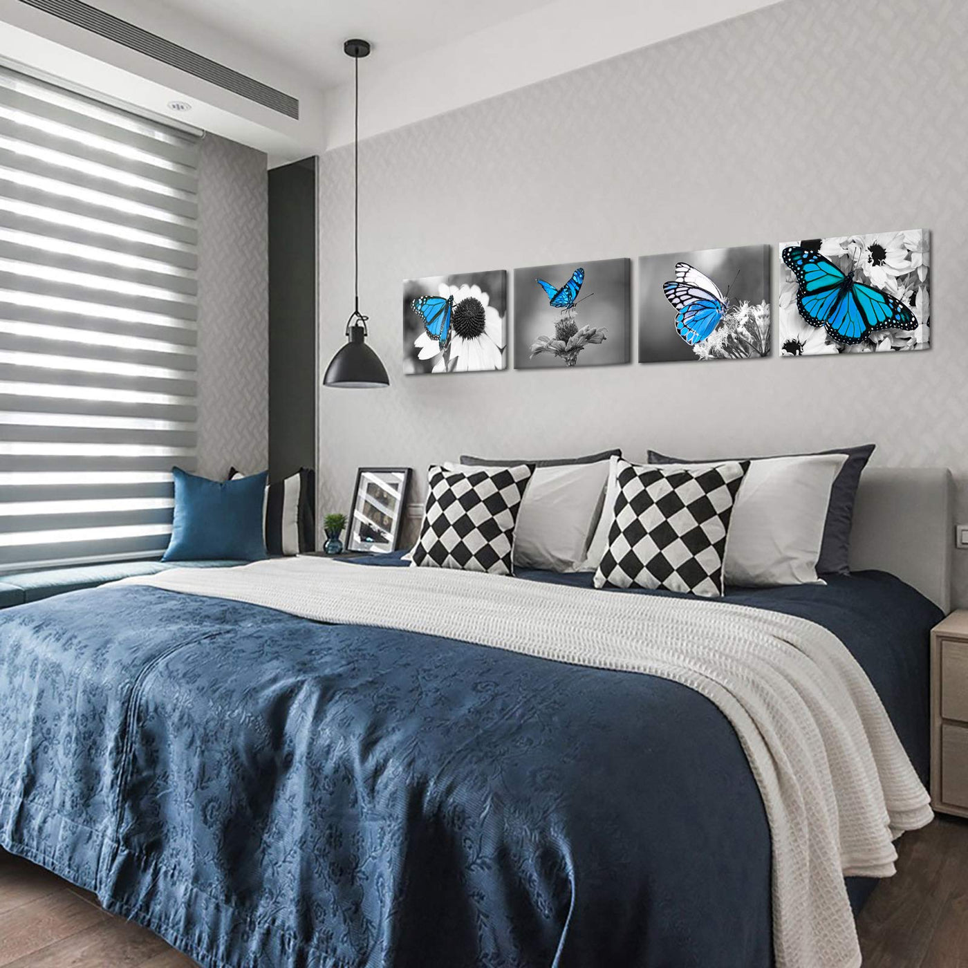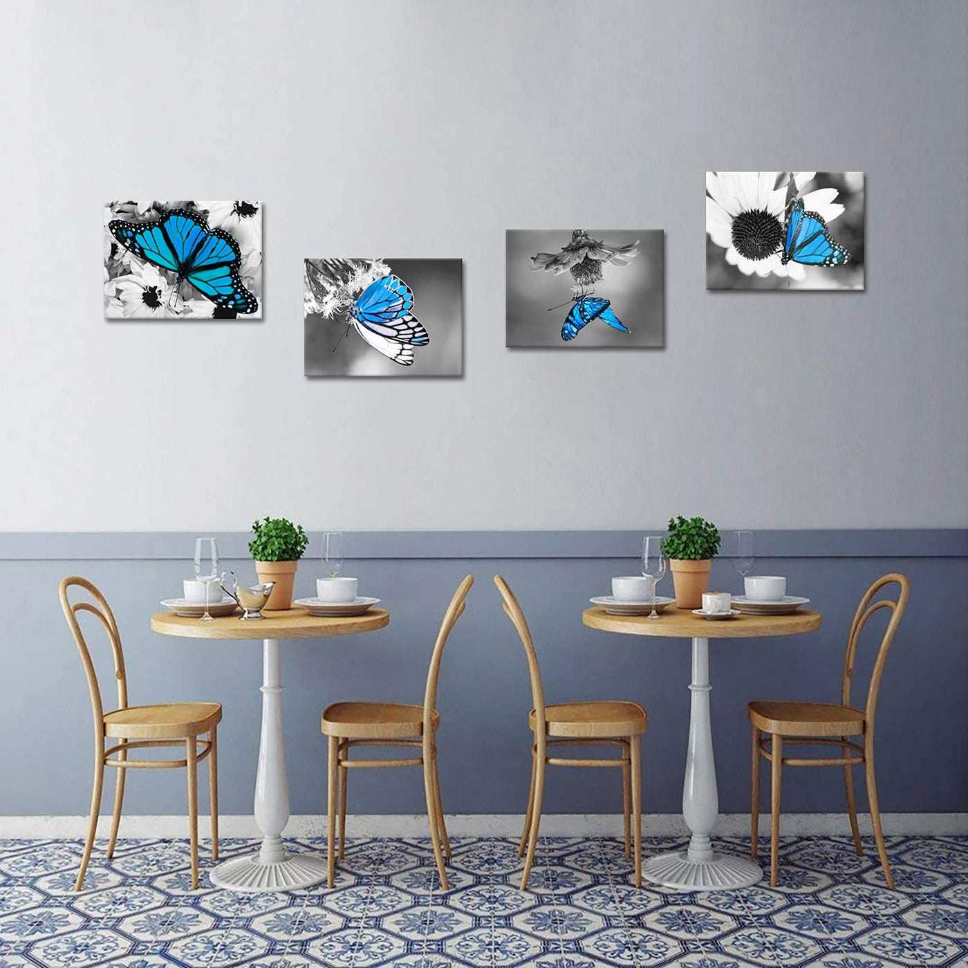 Biuteawal Flower Wall Art Blue Butterfly On Daisy Floral Picture Canvas Painting Black White Nature Landscape Artwork Home Kitch
