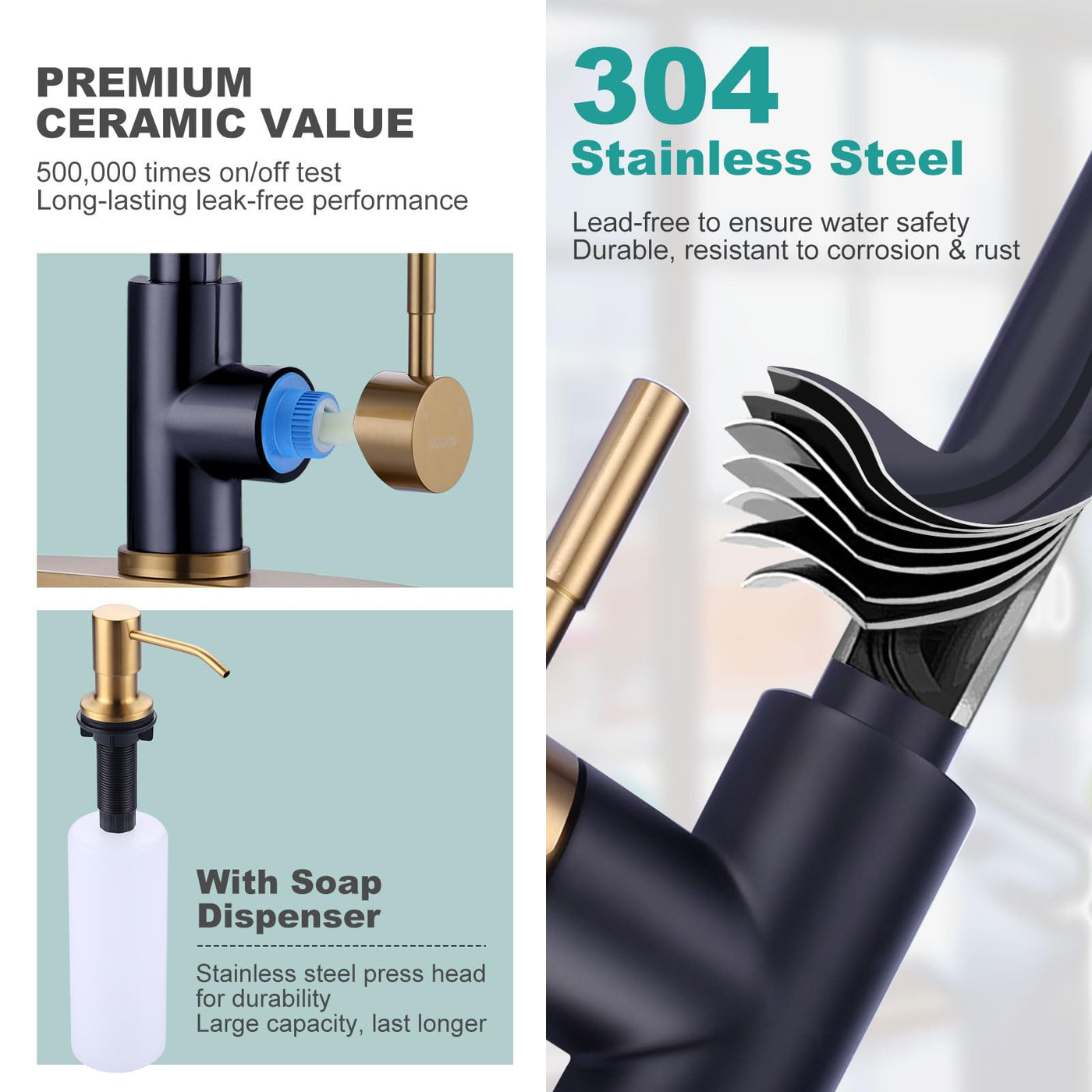 Black And Gold Kitchen Faucet With Soap Dispenser, Wowow Stainless Steel Kitchen Sink Faucet Single Handle High Arc Utility Sink