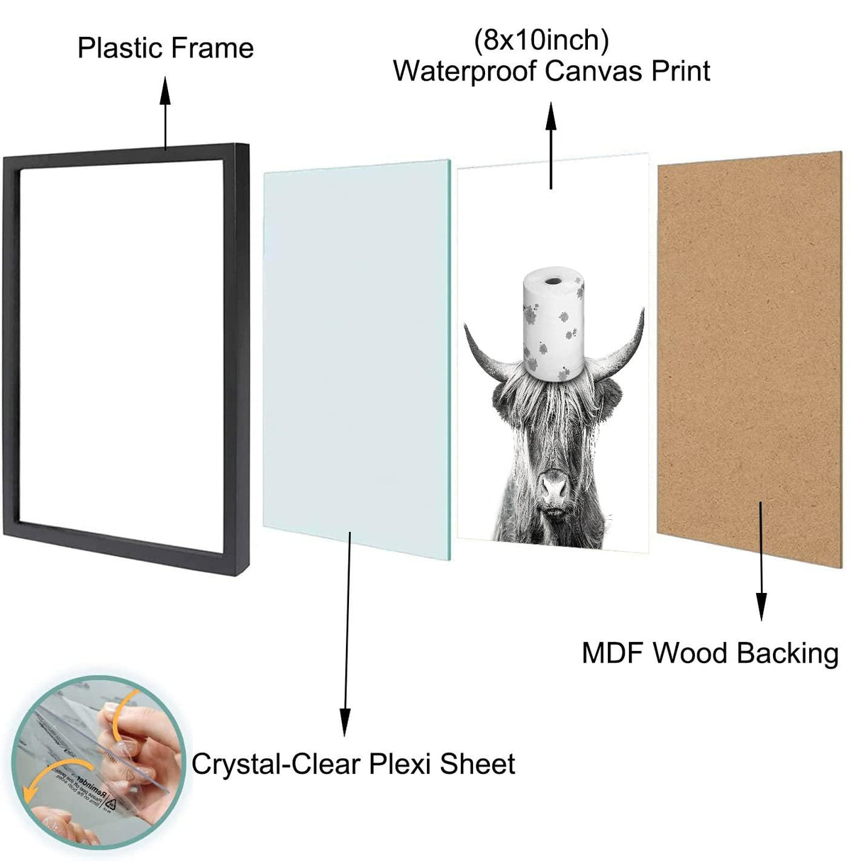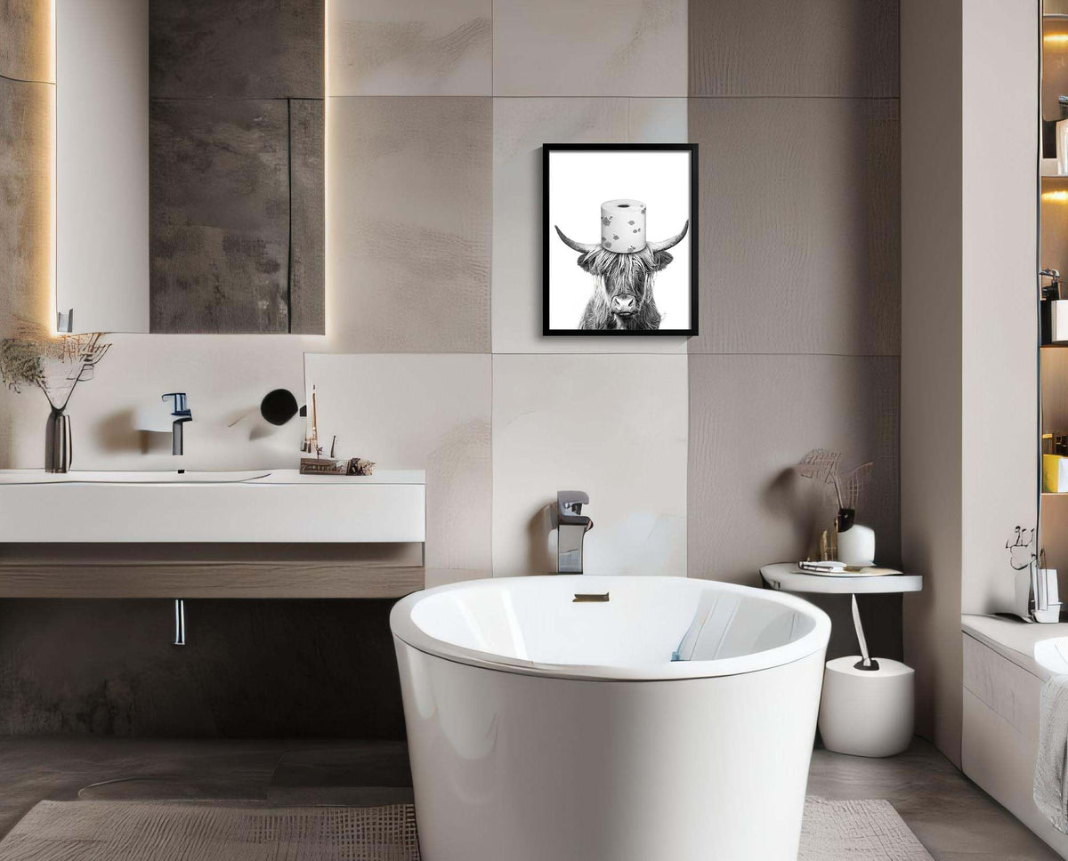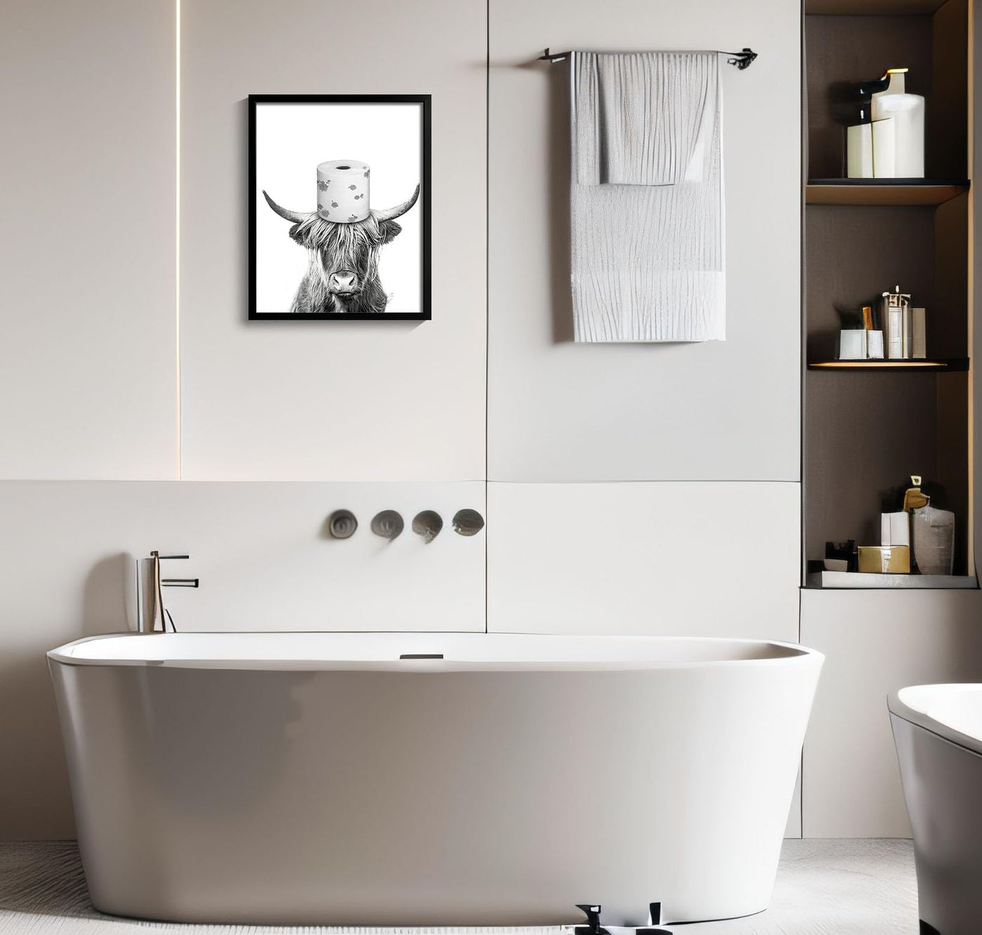Black And White Highland Cow Wall Art, Framed Funny Bathroom Wall Decor, Cute Highland Cow Canvas Print, Funny Kid'S Room Decor