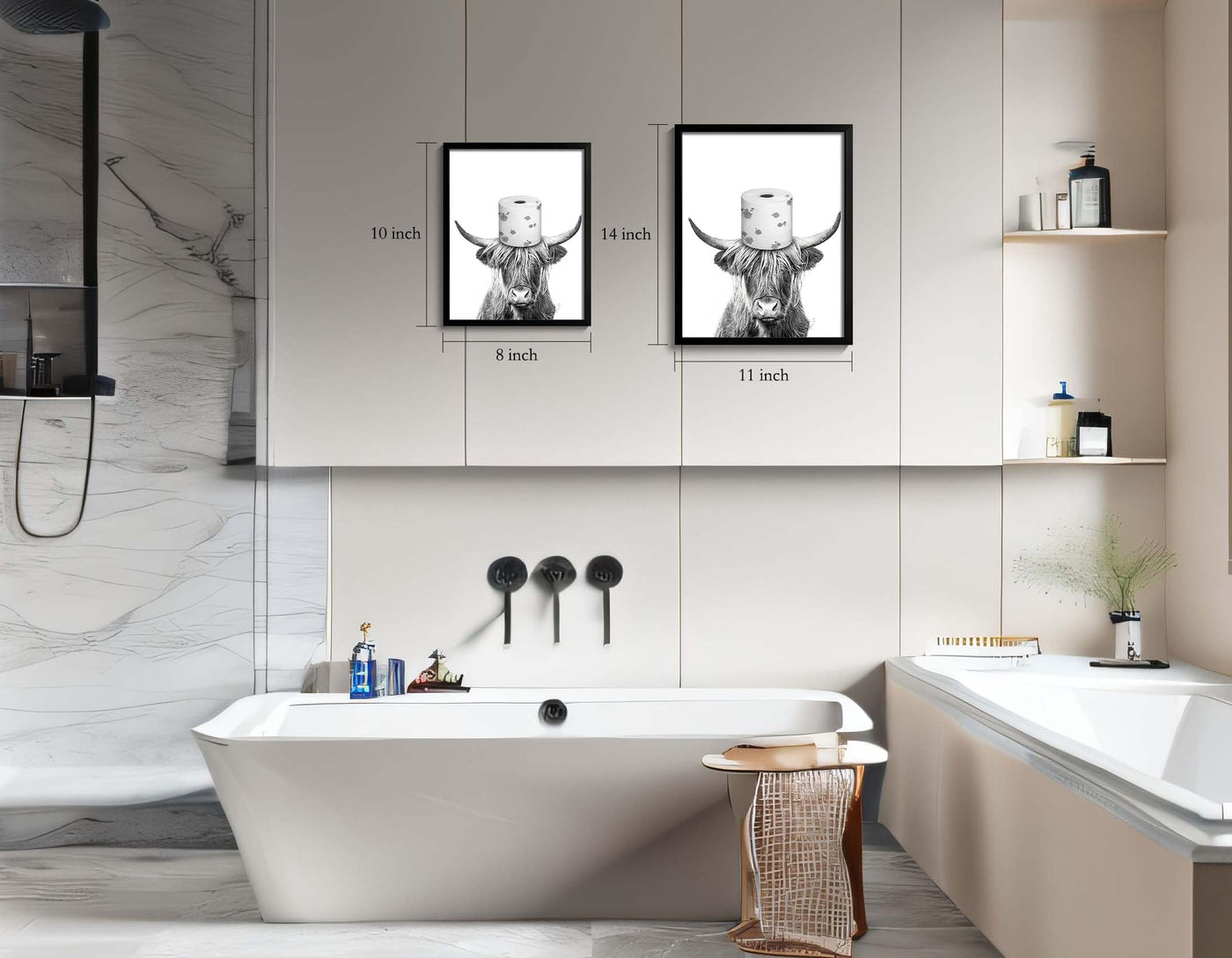 - Q: What size is the Black and White Highland Cow Wall Art? A: The Black and White Highland Cow Wall Art measures 8 inches by 10 inches, making it a perfect size for small spaces.