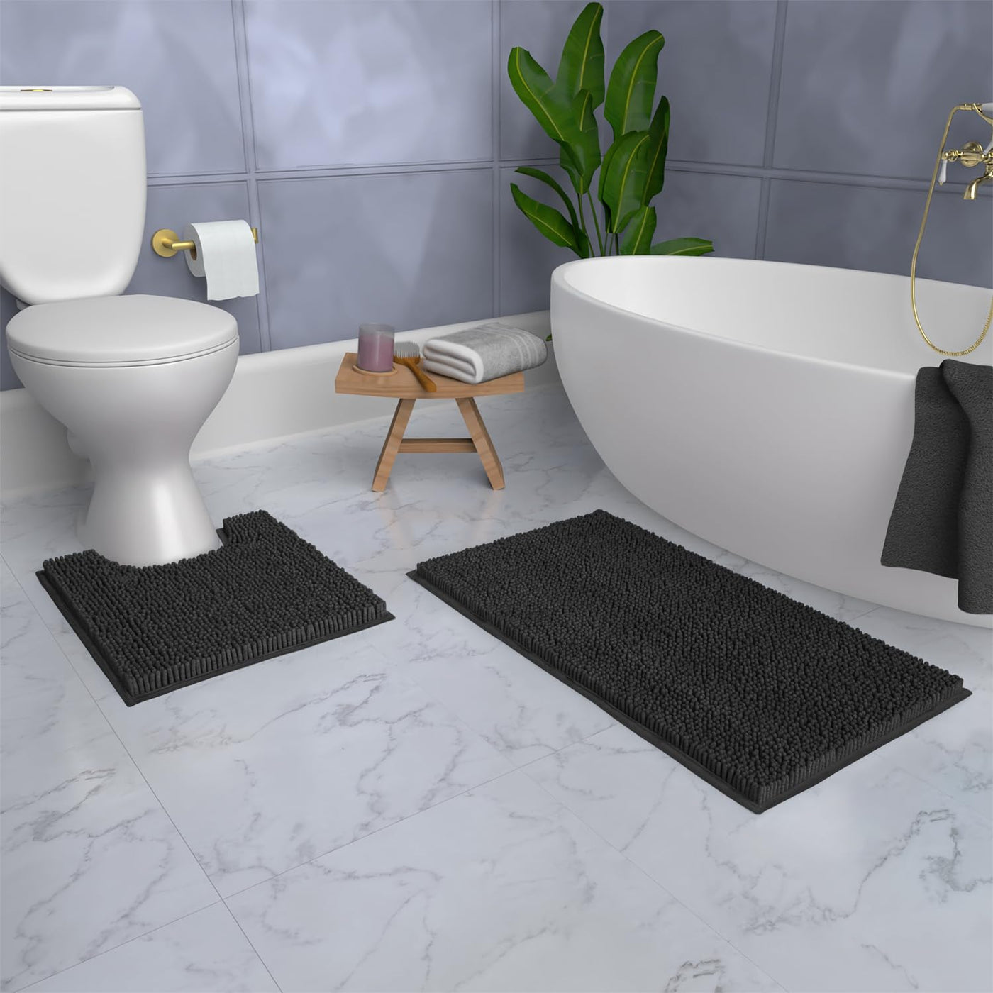 Black Bathroom Rugs Sets 2 Piece, Luxury Chenille Bath Mat Set, Soft Plush Anti-Slip Bath Rug + U-Shaped Toilet Mat. Microfiber