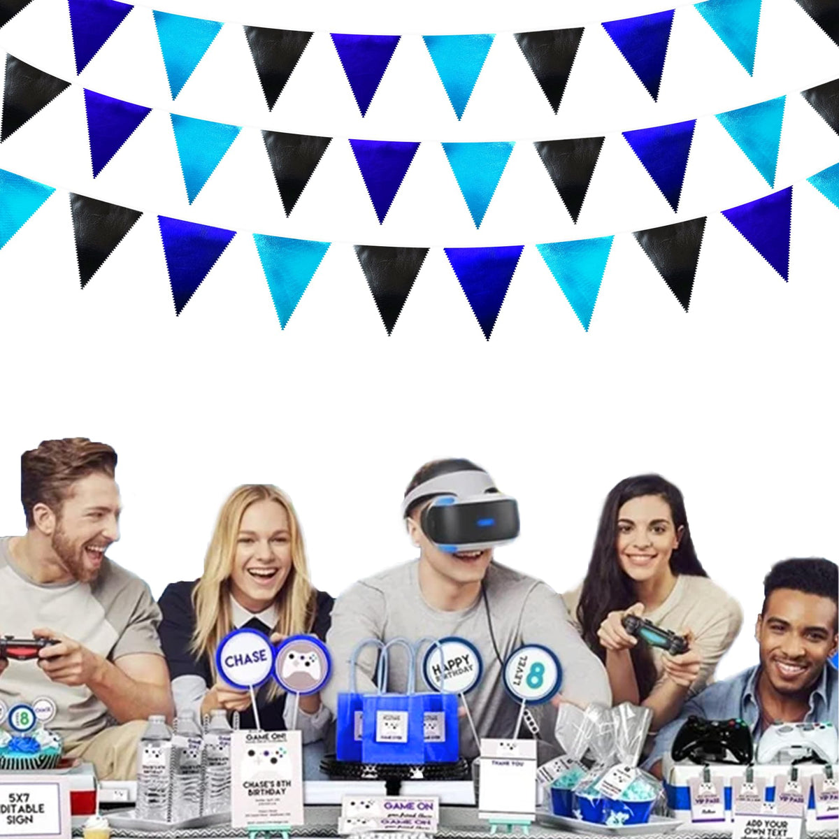 Black Blue Party Decorations Metallic Fabric Triangle Pennant Banner Flag Bunting Garland For Video Game Nautical Birthday Gradu
