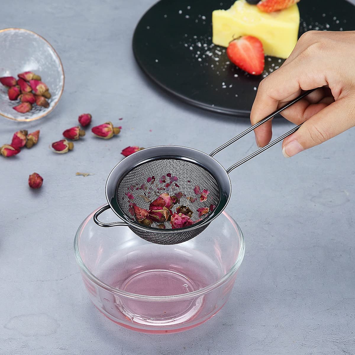- Q: What types of food can I strain with the HOMQUEN mesh strainers? A: You can strain various foods including flour, spices, rice, juice, coffee, powdered sugar, tea, cocktails, and pasta.