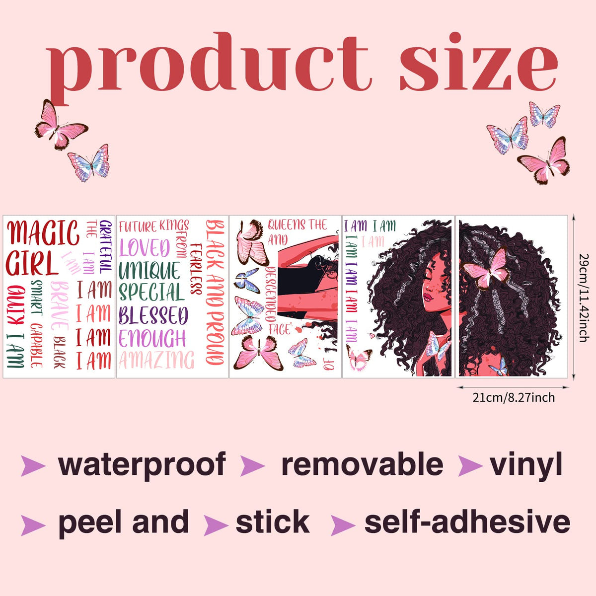 • Q: What are the dimensions of the Black Girl Wall Decal? A: The Black Girl Wall Decal has dimensions of 29 x 21 cm, which is approximately 11.42 x 8.27 inches.