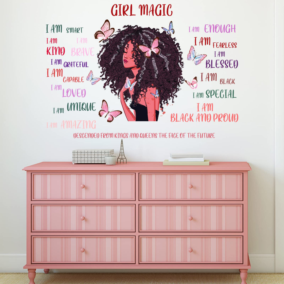 • Q: What types of designs are featured on the decals? A: The decals feature cute girls, butterflies, and inspirational quotes, creating a colorful and lovely atmosphere in any room.