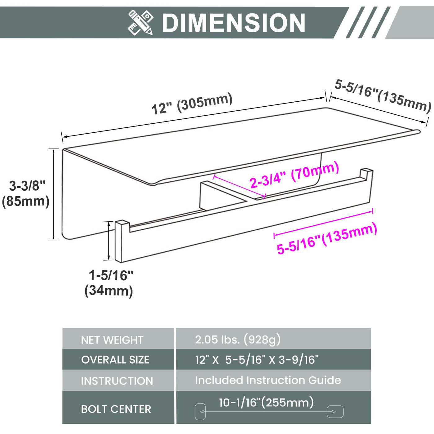 - Q: What are the dimensions of the Suyar Toilet Paper Holder? A: The overall size of the holder is 12 inches in length, 5-5/16 inches in depth, and 3-9/16 inches in height.