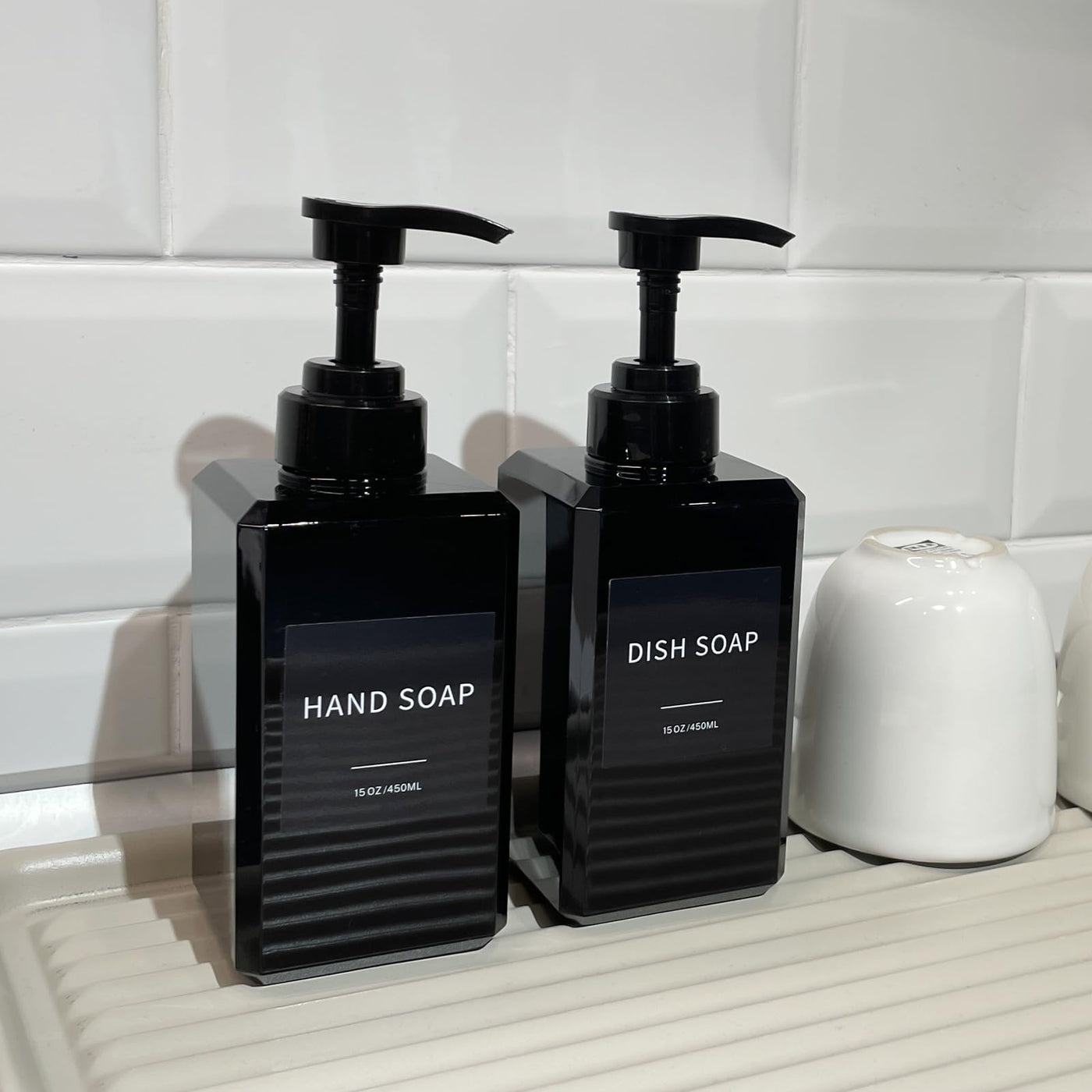 - Q: What types of labels are included with the soap dispensers? A: The set includes 12 waterproof labels, such as 'DISH SOAP', 'HAND SOAP', 'SHAMPOO', 'CONDITIONER', and a blank DIY label for customization.