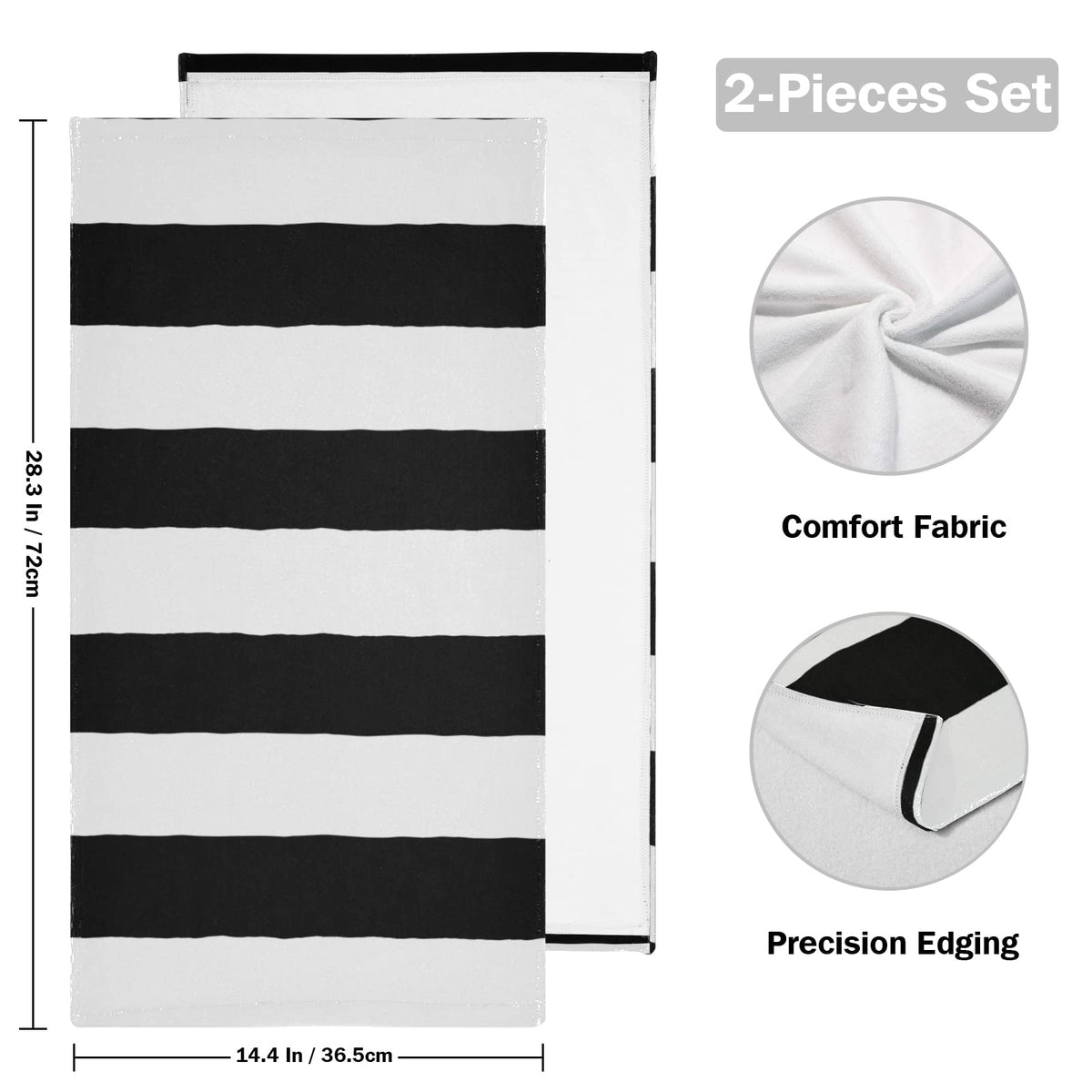 - Q: What colors are available for this towel set? A: This specific towel set features a black and white stripe design.