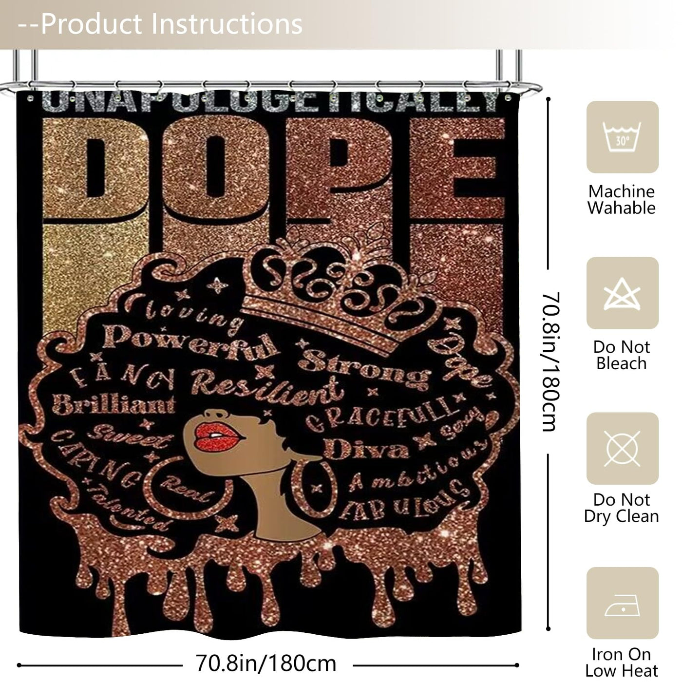 - Q: What kind of decor style does this shower curtain fit? A: This shower curtain features a blend of black art and inspirational quotes, adding a stylish and motivational touch to your bathroom decor.